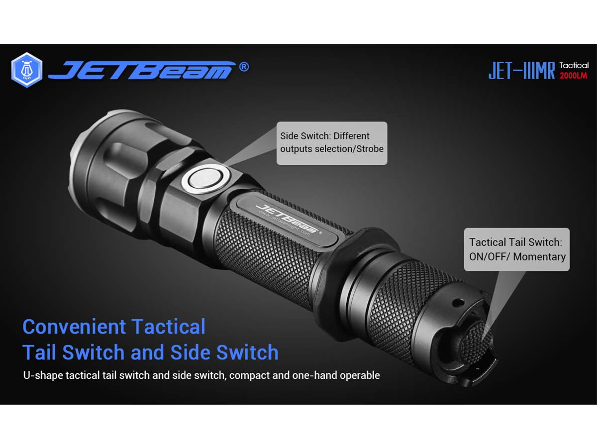The Jet-IIIMR is the newest addition to the Jetbeam tactical line of flashlights. Built tough and specifically designed to be used in a variety of demanding applications, situations and professions. The Jet-IIIMR is compact and lightweight, measuring a little over 6 inches long this light fits comfortably in any hand (bare or gloved). Its machined knurling, anti-roll design and included tactical ring provide a comfortable but secure grip, even through extreme or extended use. Constructed from aero-grade aluminum alloy with a military grade hard-anodized finish, it is impact, scratch and corrosion resistant. The O-ring seals allow it to have a waterproof rating of IPX-8, so you can use it in any weather without fear of damage. Equipped with intelligent temperature control and a digital constant current circuit, you can use this light for long periods of time without having to worry about damaging the LED or battery from over-heating and over-discharging.