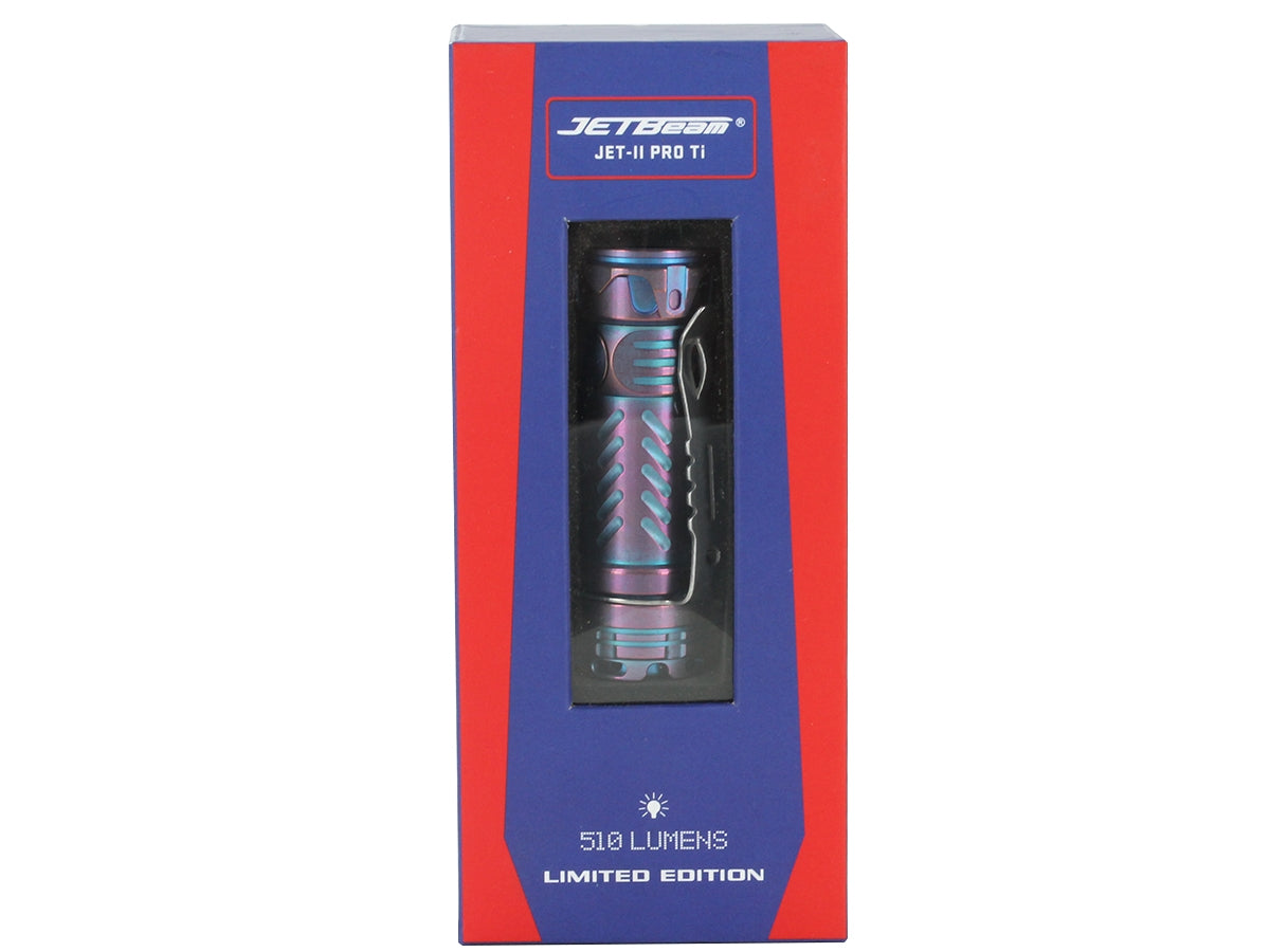 CREE LED with 510 lumensFeaturing powerful LED output and a compact yet durable titanium body, the Jetbeam II PRO Ti is the latest in Jetbeam's line of incomparable EDCs. This light harnesses the power of a CREE XP-L HI LED to produce a tremendously bright 510 Lumens, plenty of power for indoor or outdoor use. Multiple lighting levels allow you to adjust this light to your needs, making it a great choice for everyday scenarios. The powerful titanium body is functional as well as stylish, coming in 2 unique finishes.