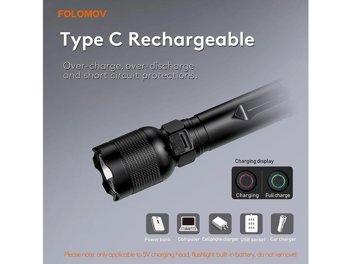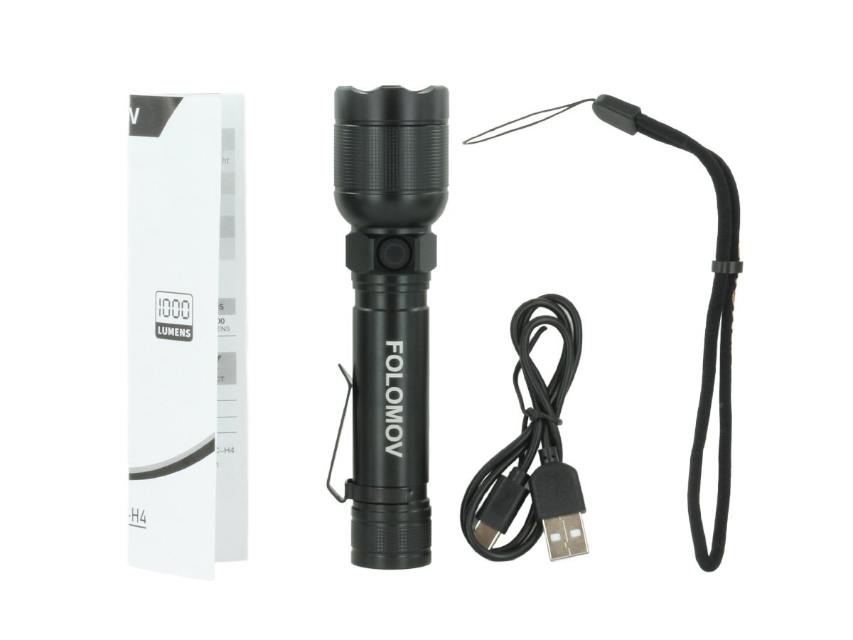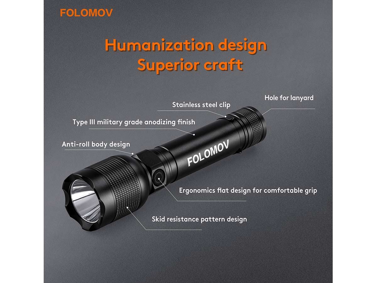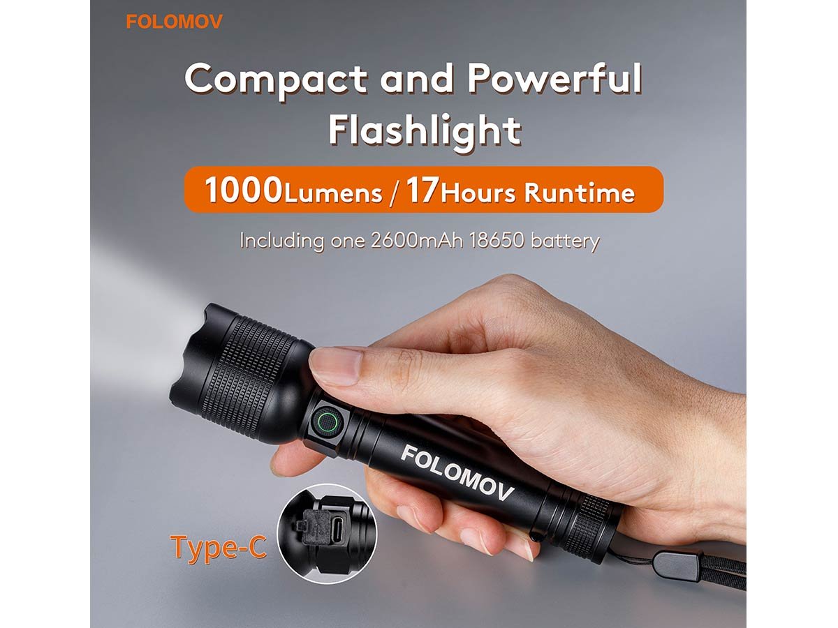 Folomov EDC H4 USB-C Rechargeable LED Flashlight - Nichia NVSW519A - 1000 Lumens - Uses Built-in 2600mAh Li-ion Battery Pack