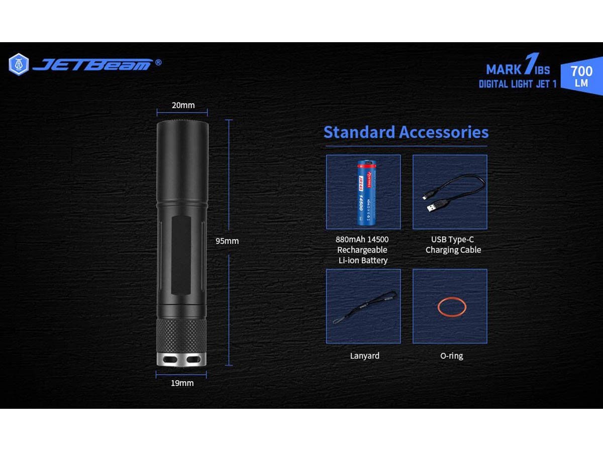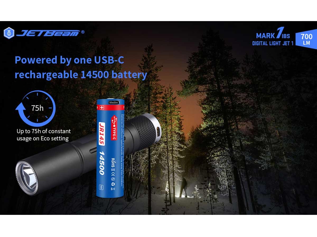 JETBeam Jet Mark 1 IBS EDC LED Flashlight - CREE XPL - 700 Lumens - Includes 1 x USB-C Rechargeable 14500