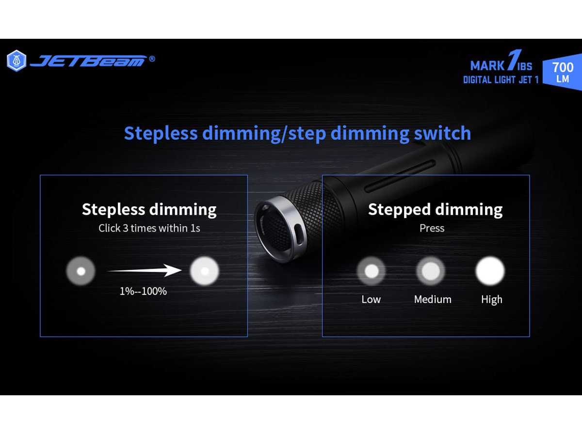 When you need a flashlight that balances an EDC body with tactical efficiency, make sure you use the JETBeam Jet Mark 1! With a maximum output of 700 lumens in a 492ft beam, you can easily handle odd jobs at home or on the job. Its stepless dimming function also gives you precise output control, ensuring you have enough lighting to see the task at hand. Whether it's for your next camping trip or work shift this light quickly adjusts to give you the exact brightness required!
