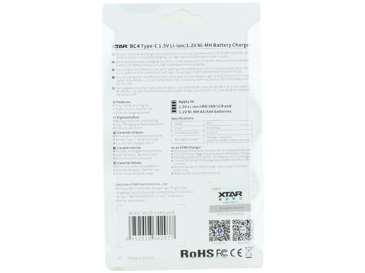 The XTAR BC4 is a smart charger with four independent bays, allowing it to charge 1.5V li-ion and 1.2V NiMH AA/AAA batteries simultaneously. Multiple safety features such as overheat, overcharge, and short circuit protection keep you and your home safe.
