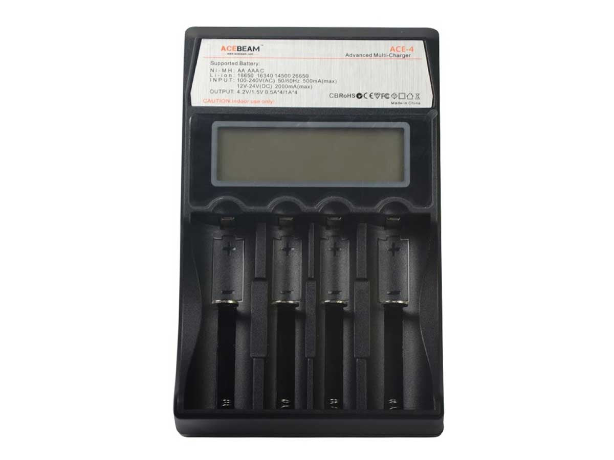 The Acebeam Ace 4 is a four bay smart charger for li-ion, NiMH, and NiCD batteries. This charger features four independent bays that quickly and safely charge the batteries that power your everyday devices. A detailed LCD screen display keeps users informed on charging levels, as well as other vital battery information. The Ace 4 is a Smart Charger, so it will automatically detect when a battery is finished and will cease charging. The charger also features integrated over charge and short circuit protections that make it safe to use at home or work.