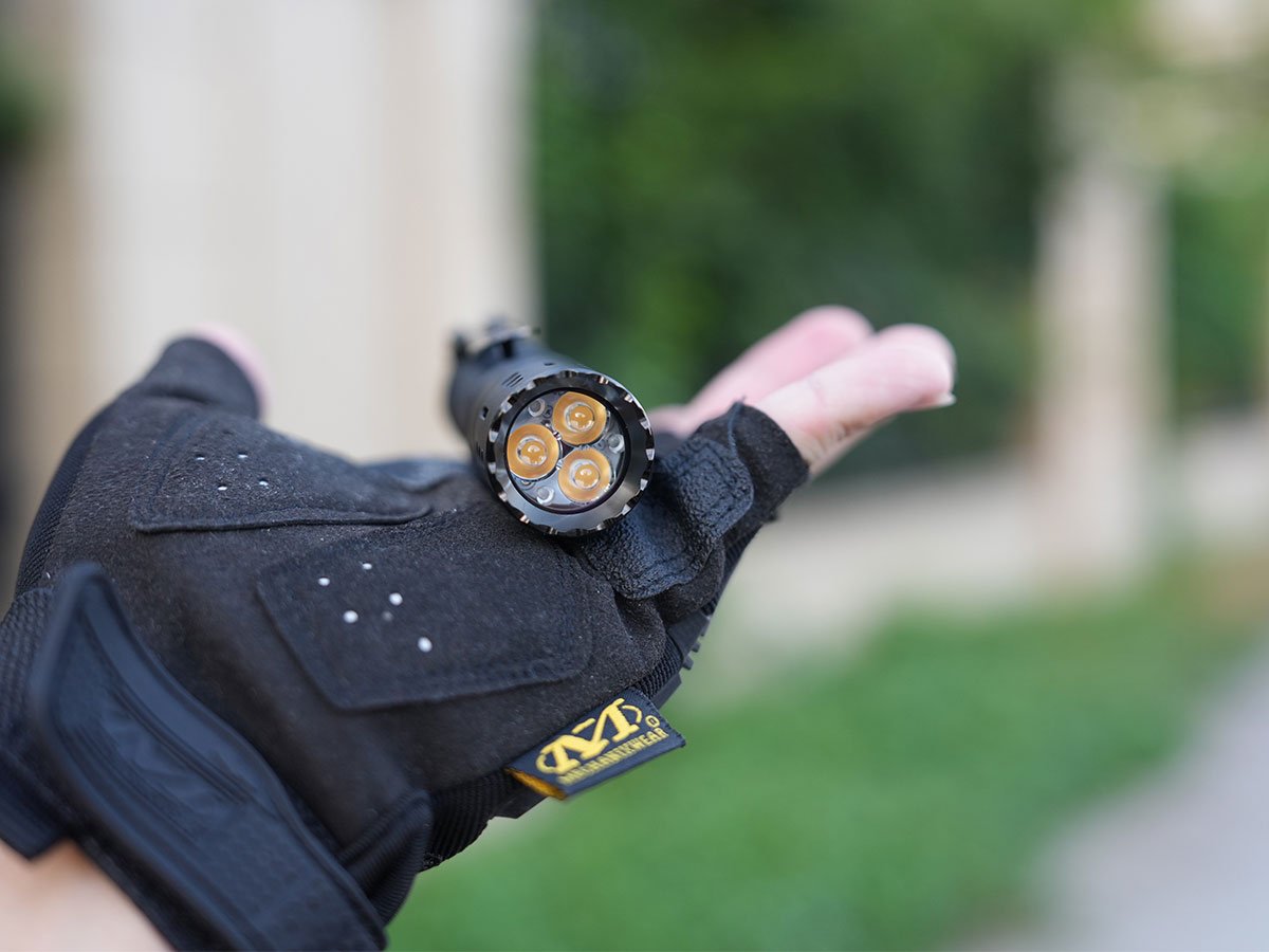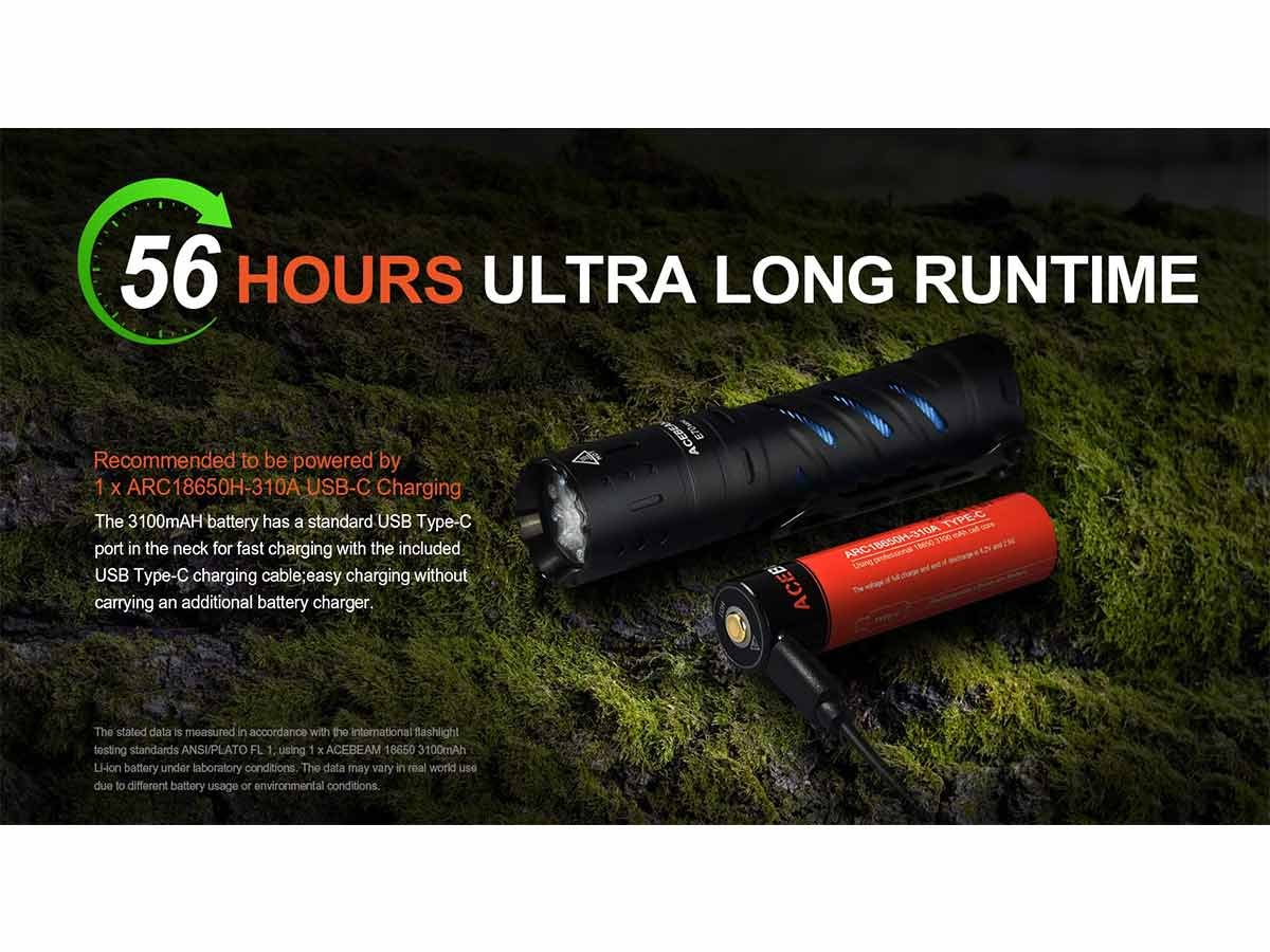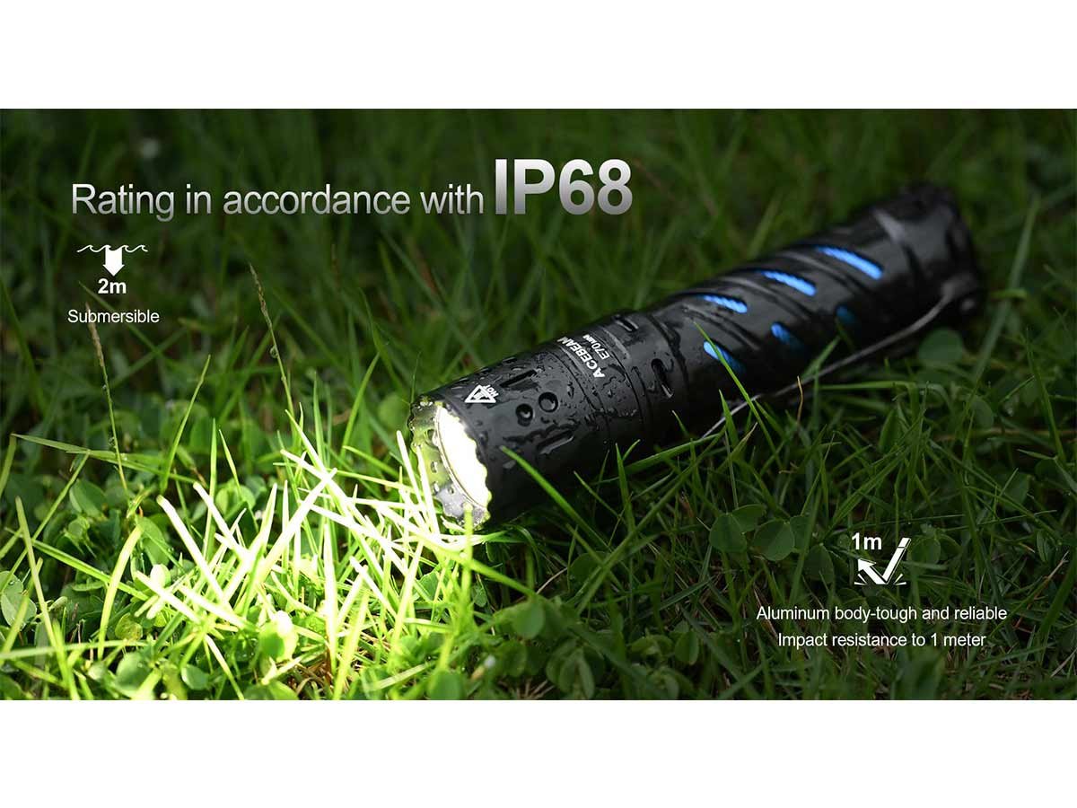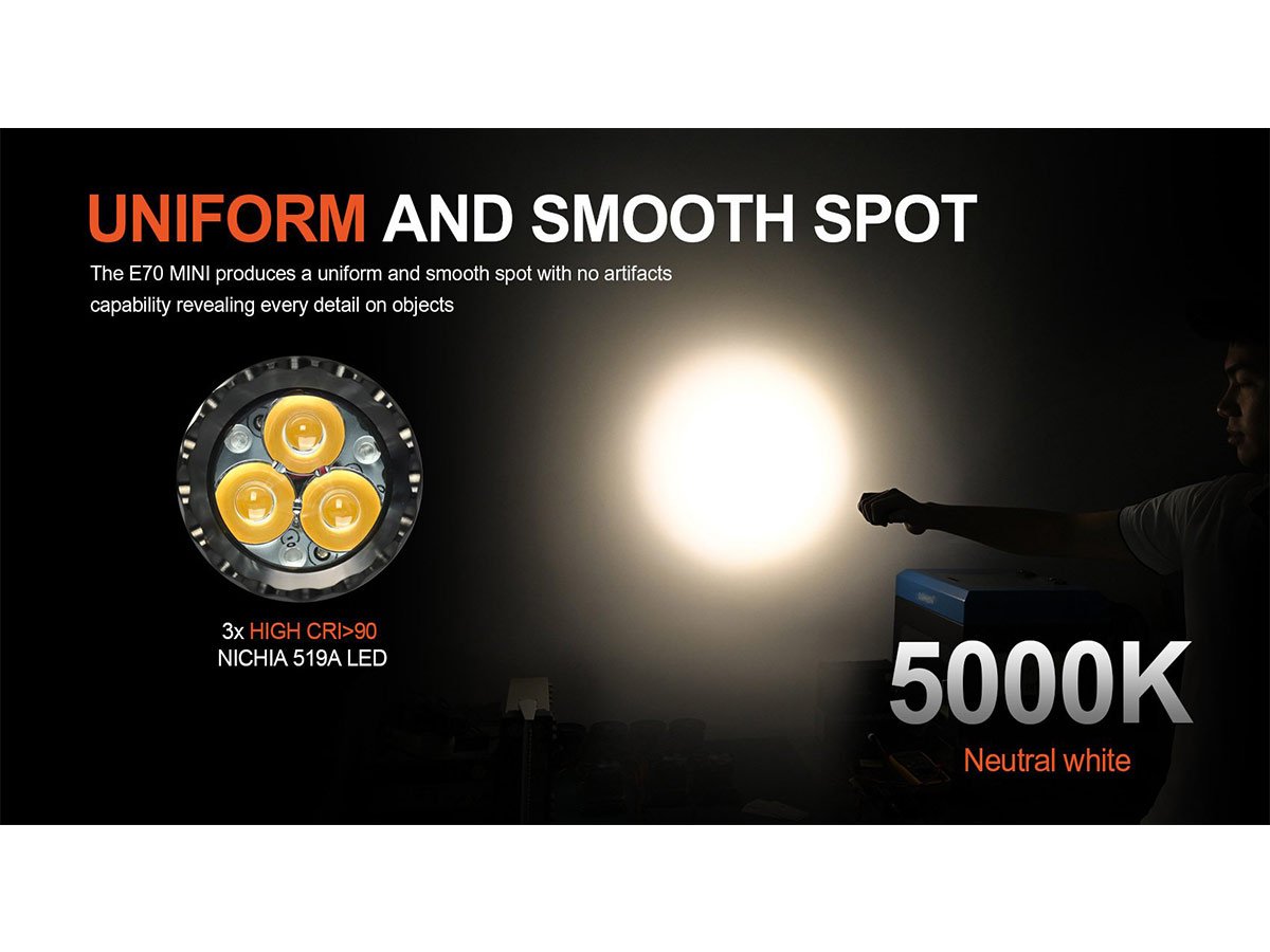The Acebeam E70 Mini is packed with 3 Nichia 519A LEDs, for a 90+ CRI rating that puts your vision first. The high CRI rating and customized TIR lens offers natural, balanced light for less eye strain during use and accurate color rendering. If you paint or work with electrical wiring, the E70 Mini helps immensely! Not only that, but this light easily reaches a max 2,000 lumen output to fully see your surroundings with powerful illumination.