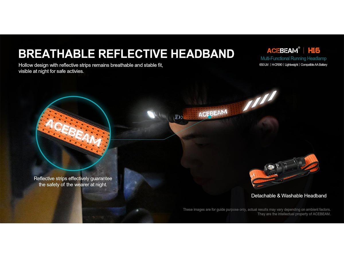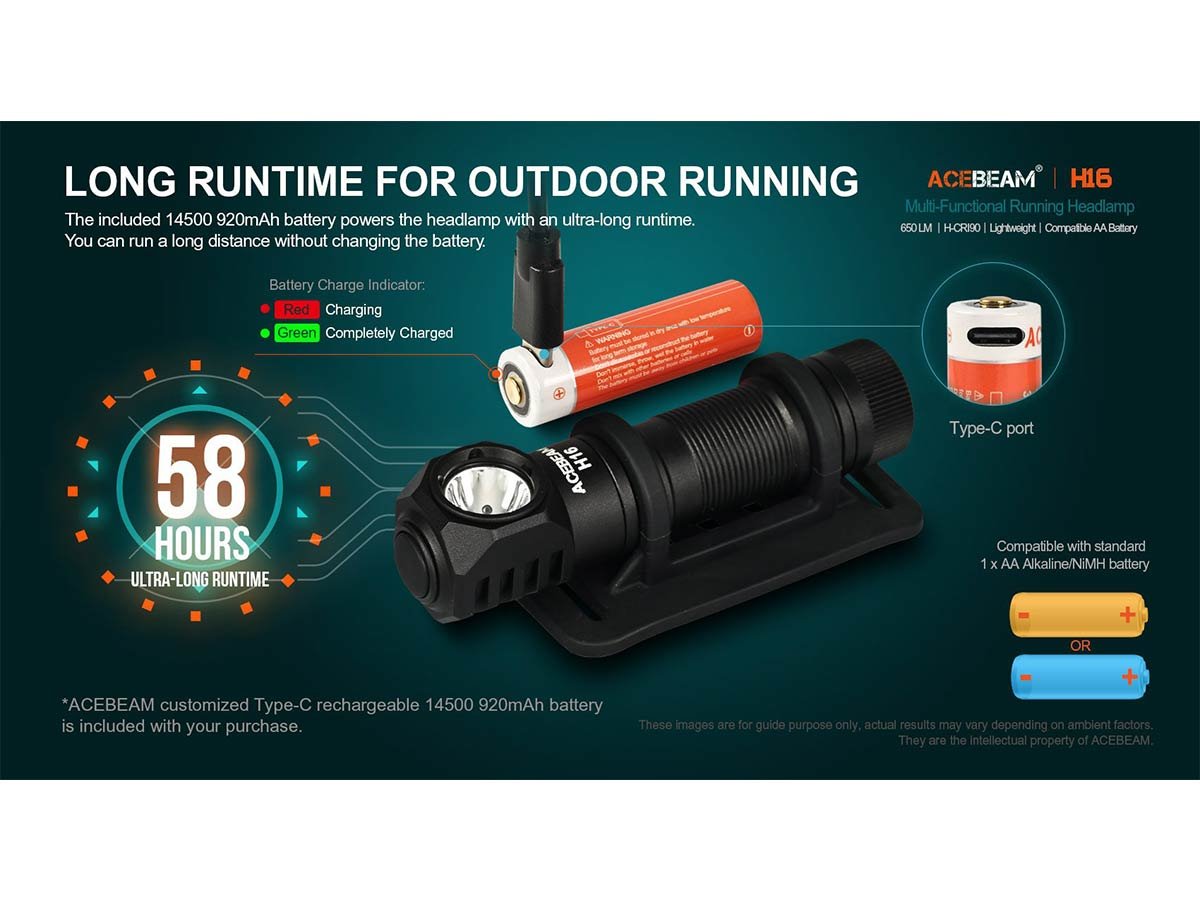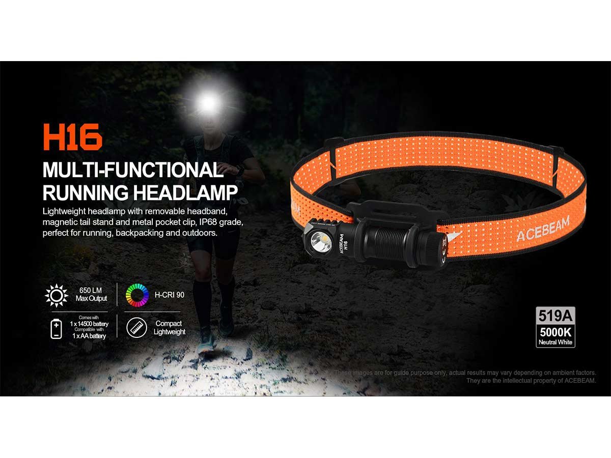 Acebeam H16 Lightweight LED Headlamp - Includes 1 x USB-C Rechargeable 14500 - 900 to 650 Lumens - 6500K to 5000K Color Temperature