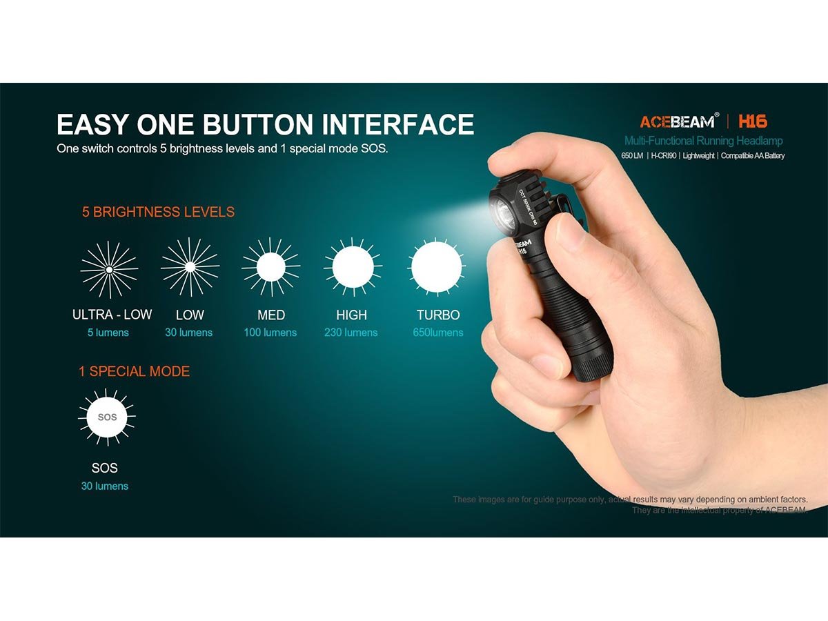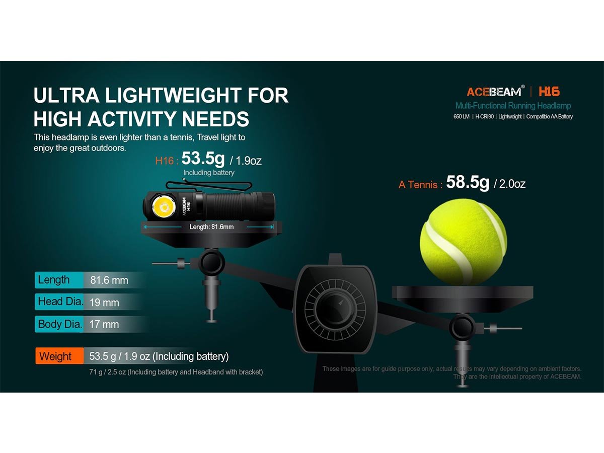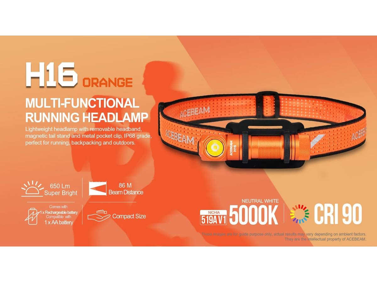Acebeam H16 Lightweight LED Headlamp - Includes 1 x USB-C Rechargeable 14500 - 900 to 650 Lumens - 6500K to 5000K Color Temperature
