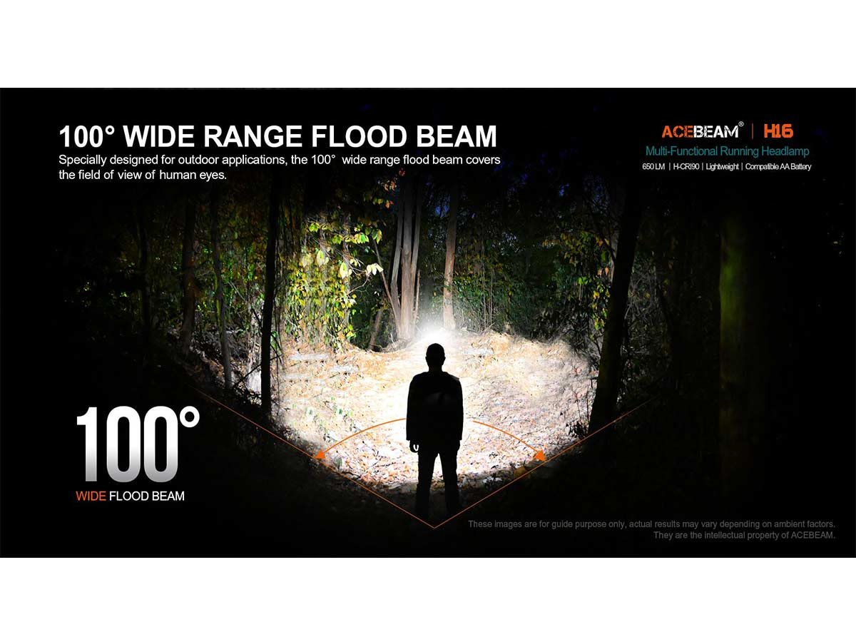 The choice is yours with the Acebeam H16 Headlamp! Have a choice of cool or neutral white color output, for a brighter light or accurate color rendering for specialized uses. The cool white H16 casts up to 900 lumens, while the neutral white H16 emits a max of 650. With a 100 to 110-degree wide-range flood beam, have peak awareness while hiking or camping and keep tabs on your surroundings at all times.