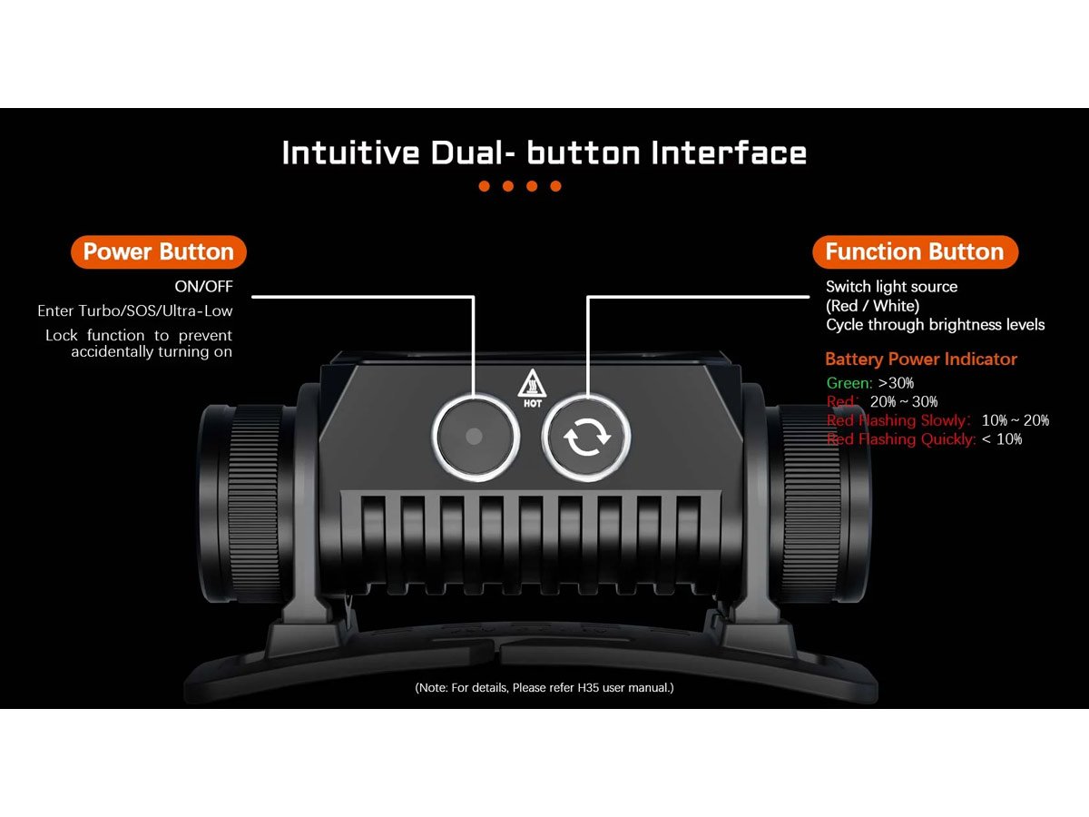 Inspired by the overhead lights of outdoor vehicles, the H35 is equipped with 5 LEDs, giving you both white and red light modes. White light mode offers 5 levels of brightness delivering optimal illumination for a range of activities like camping, night walking, or sport climbing. The Red CREE XPE LED is stronger than competitors, providing 200 lumens of brightness and more than 200 feet of throw! Red light is useful for night hunting, fishing, and work since it preserves your natural night vision, attracts fewer bugs, and is less likely to spook fish and game.