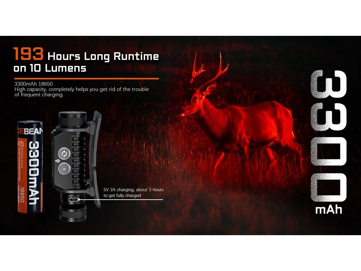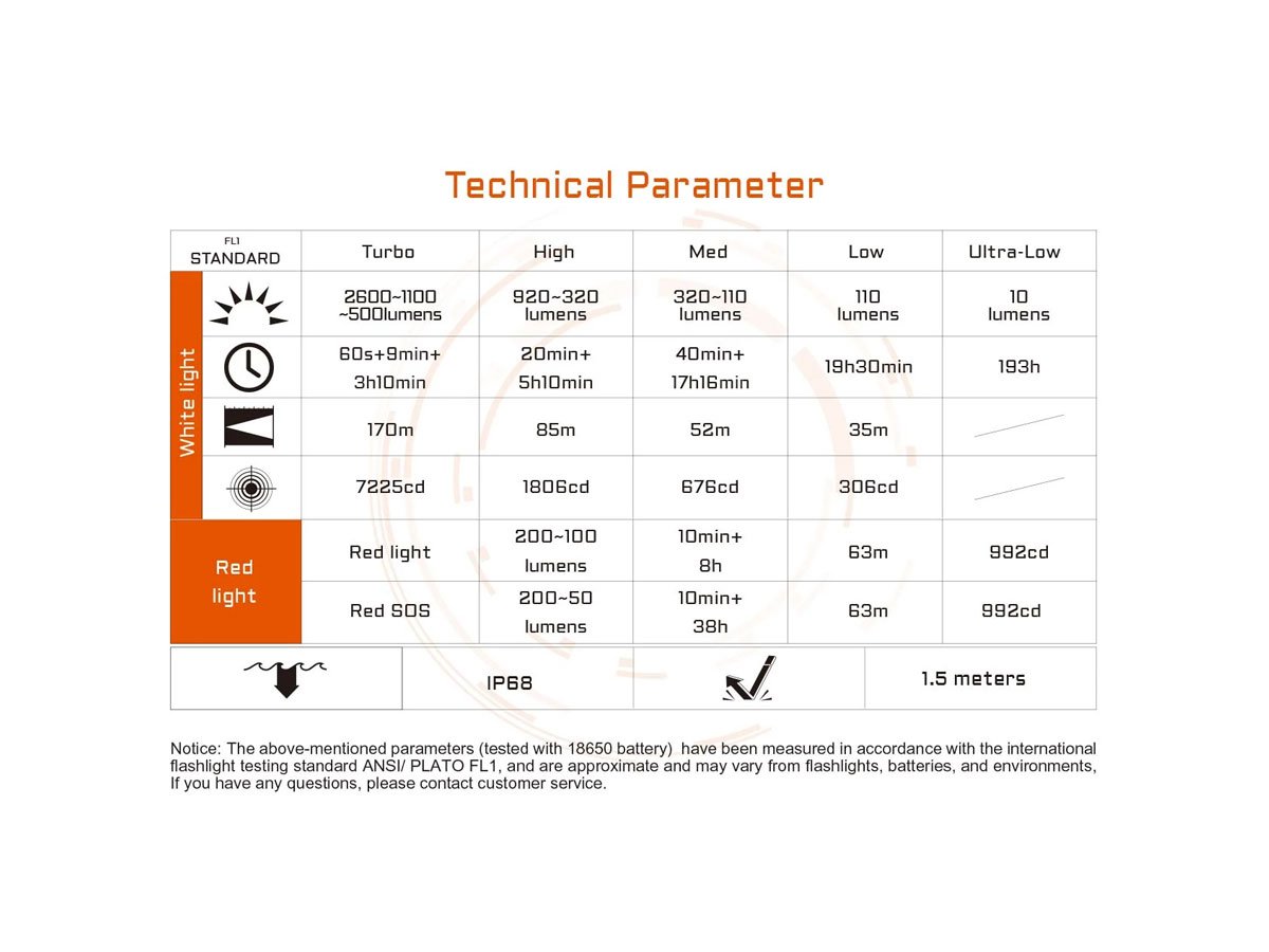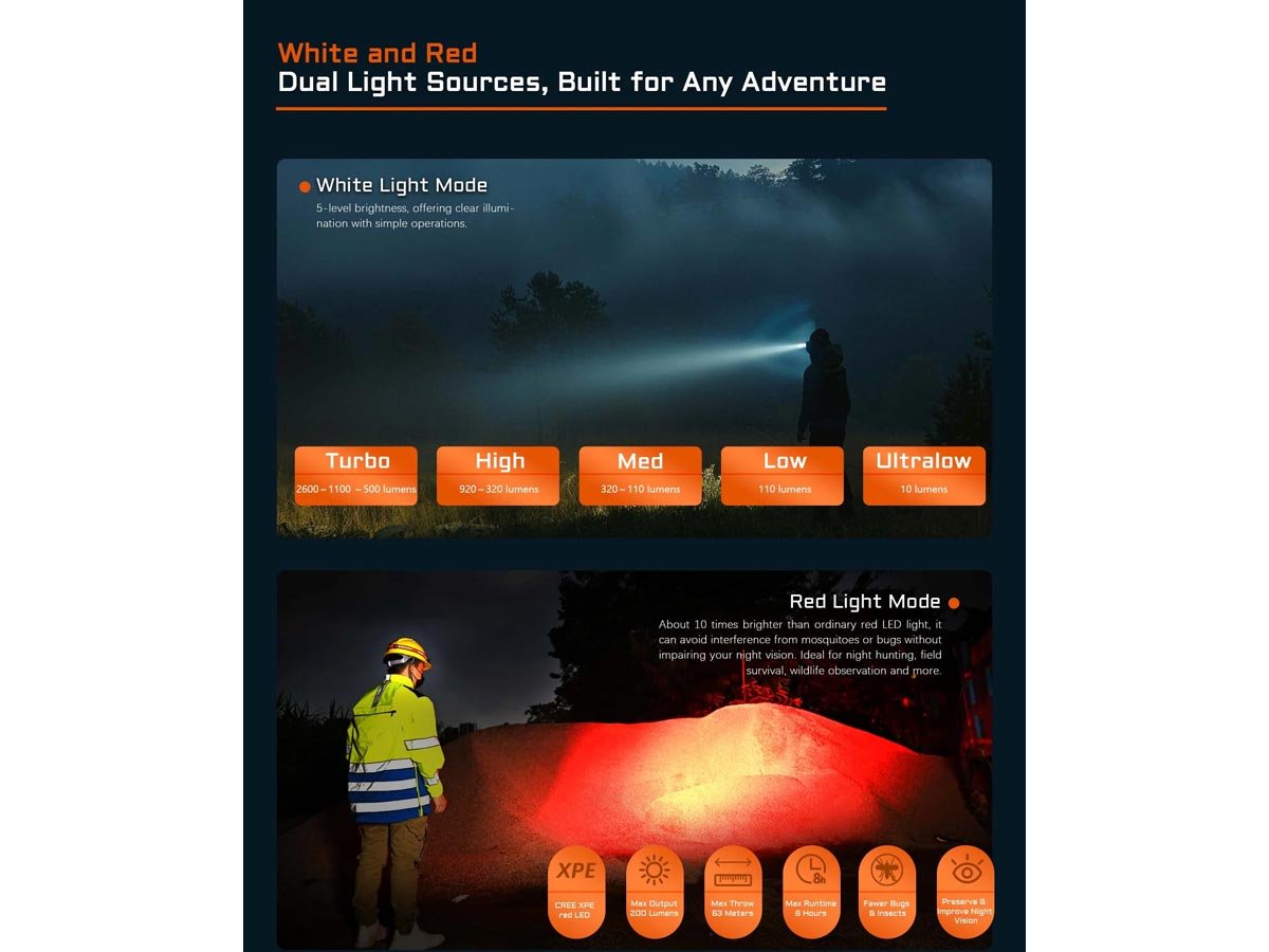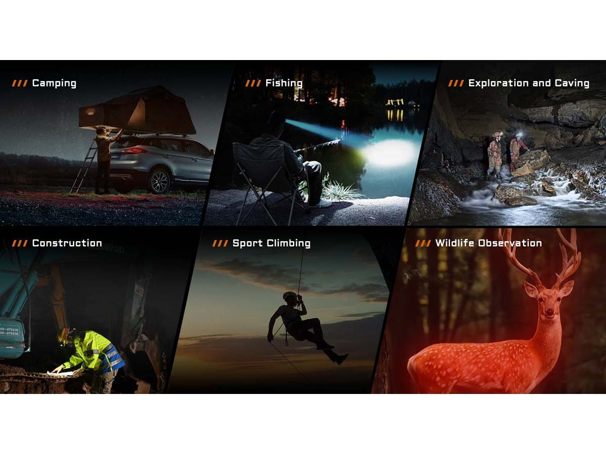 - » 550+ft white-light (200+ft red-light) max throw to see paths, camping grounds, and worksites from a distance