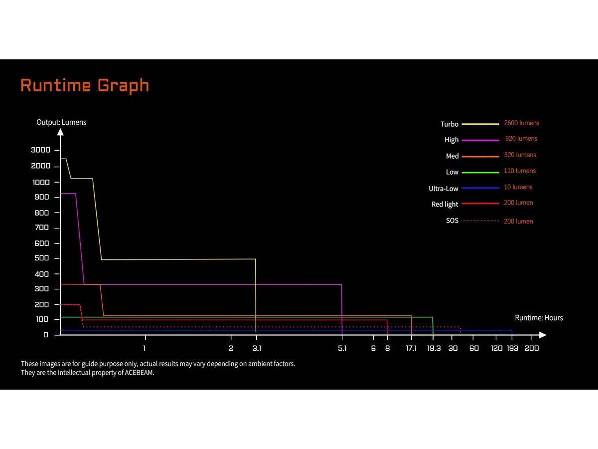| Brightness | 2600 ⥊1100 ⥊500lumens | 920 ⥊320lumens | 320 ⥊110lumens | 110lumens | 10lumens |