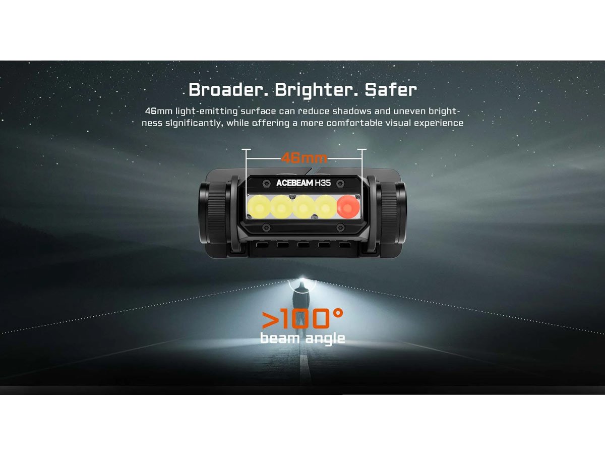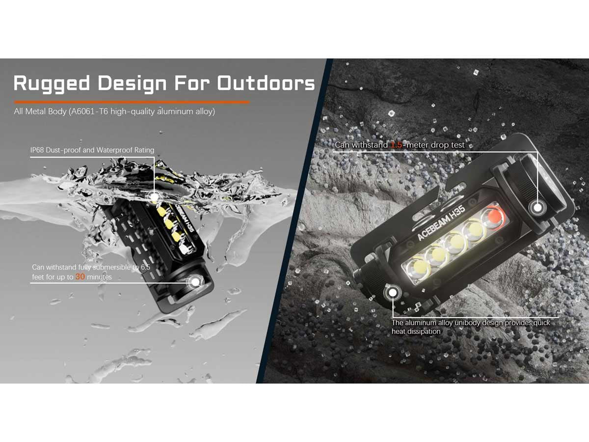The Acebeam H35 is a headlamp with up to 2600 lumens of white light for maximum visibility outdoors. With a range of 170 meters (557+ feet), you can cast bright light on campsites, hiking paths, and worksites from far away. Thanks to its 46mm light-emitting surface, the H35 outputs a broad flood light with a wide-reaching 100° beam angle. Its optimized design extends to the aero-grade aluminum alloy unibody construction, which offers a lightweight, durable build with better heat dissipation. The H35 is even resistant to impacts and a wide range of weather conditions, so it stands up to the toughest circumstances.