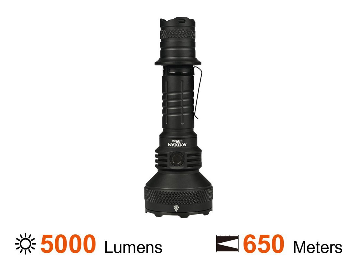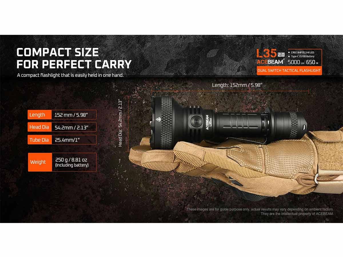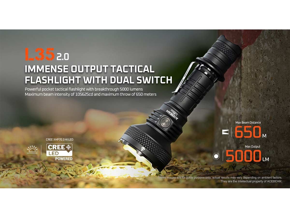 Harness the power of up to 5000 lumens with Acebeam's L35 V2.0! This high-powered tactical light shines a powerful beam up to 650 meters. Thanks to the CREE XHP70.3 HI LED, this 6-inch light is capable of reaching high-lumen outputs despite its compact size. The L35 V.20 is an excellent compact, easy-to-carry duty light that can still identify objects at long ranges while being capable of lasting long hours for close-up tasks. Shine bright on any extended trek or night-time patrol!