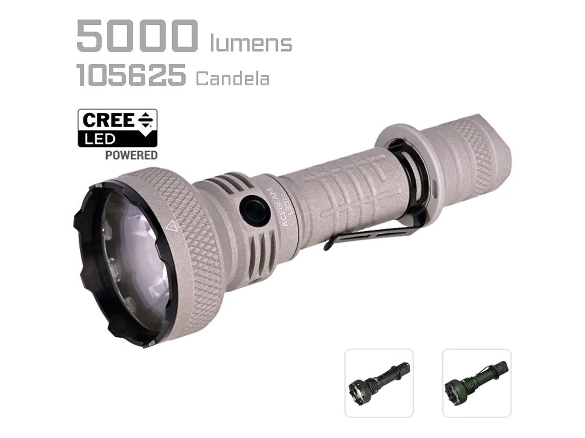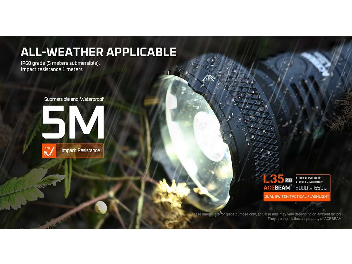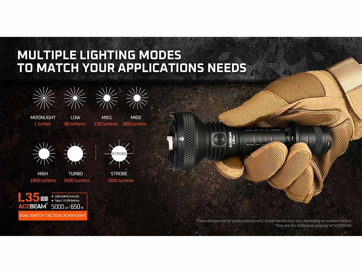 Harness the power of up to 5000 lumens with Acebeam's L35 V2.0! This high-powered tactical light shines a powerful beam up to 650 meters. Thanks to the CREE XHP70.3 HI LED, this 6-inch light is capable of reaching high-lumen outputs despite its compact size. The L35 V.20 is an excellent compact, easy-to-carry duty light that can still identify objects at long ranges while being capable of lasting long hours for close-up tasks. Shine bright on any extended trek or night-time patrol!