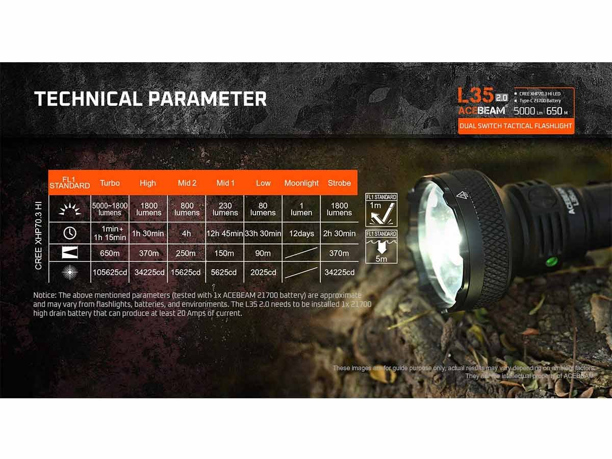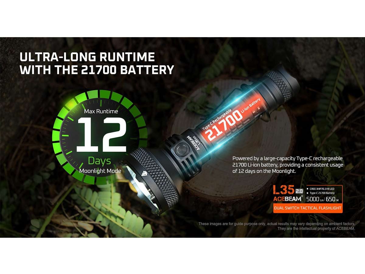 Acebeam recommends running the L35 V2.0 with a high-drain 21700 capable of 20A discharge. A 15A 21700 battery is included, but you can stock up on a backup 21700 with 20+ Amp discharge under "Accessories".- Notable Features