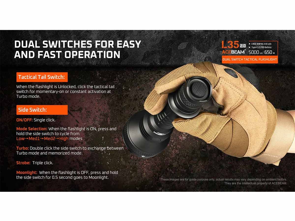 The dual side and tail switches provide you with deft control over your 6 output modes. The side switch controls activation, and allows you to toggle through low to high modes. The tail switch gives you direct, instant access to turbo and strobe modes, making this a great light to be used in tandem with other tools. The wide range of brightness levels suits all tasks, whether close-up or long-range. You'll love the versatility the L35 V2.0 brings to the job at hand!