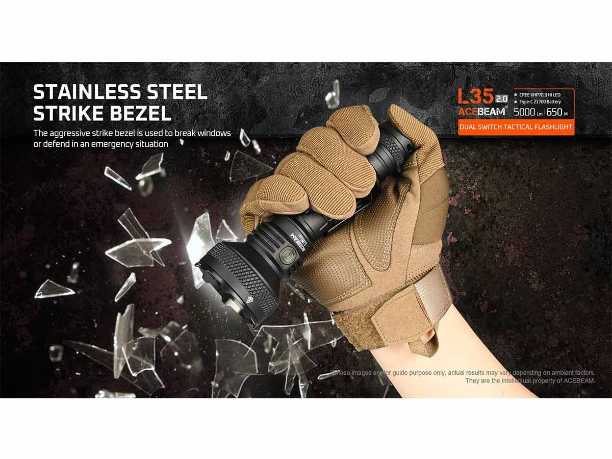 The L35 V2.0 has a rugged construction that is ready to face any environment. A stainless steel strike bezel lines the head of this light, enabling the user to swiftly break glass. An IP68 rating protects you from water and dust, allowing you to take the L35 V2.0 in the rain or even submerge it in water up to 5m! This gives you seamless illumination no matter what environmental conditions you're facing. To round it off, a powerful 21700 battery keeps this light powered for up to 12 days on moonlight mode! The L35 V2.0 is built to last through long missions, extended work days, and overnight trips.