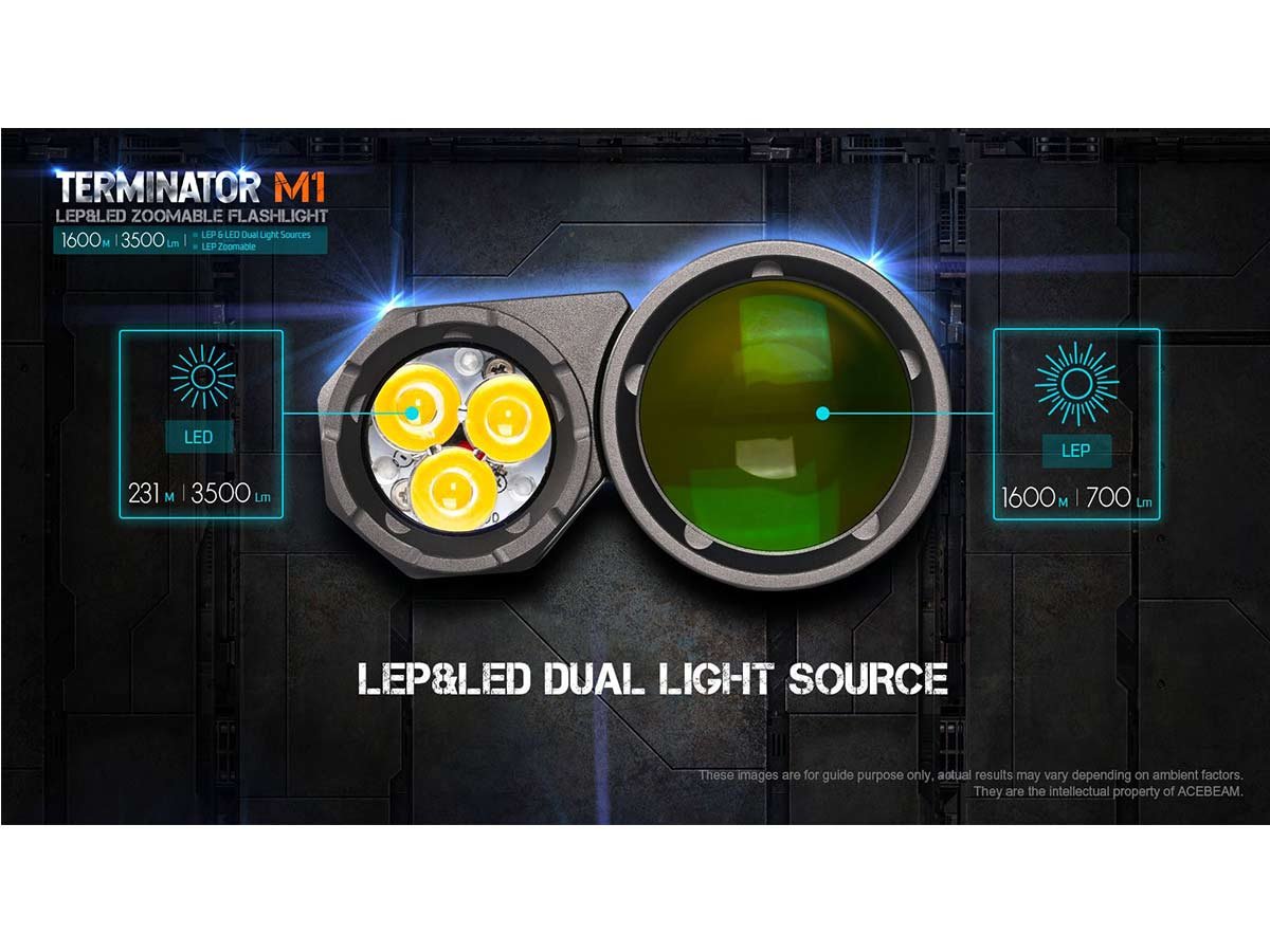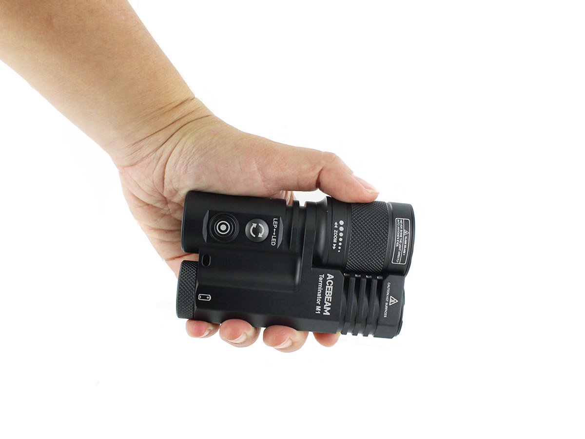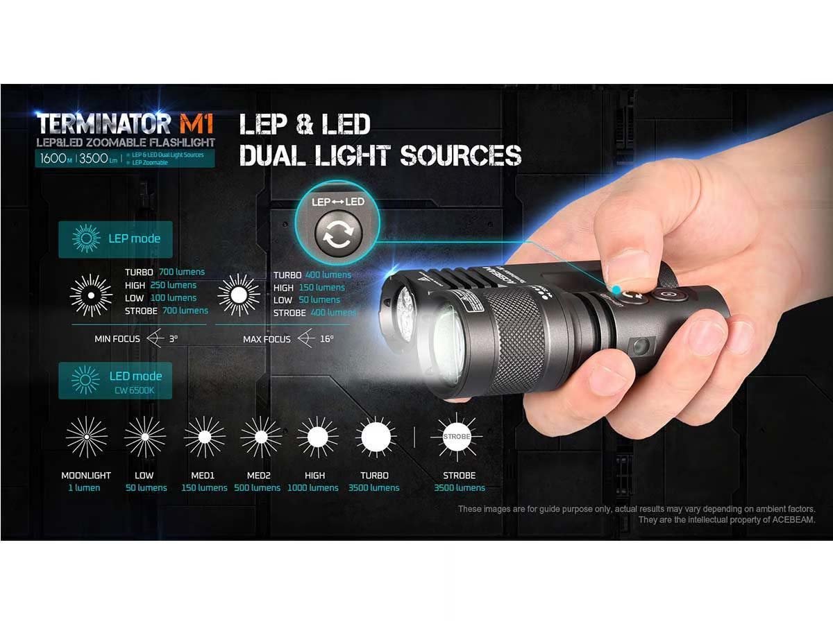 Acebeam's Terminator M1 is a flashlight that does everything you need! With a dual LEP and LED construction, you'll have the power of a spotlight and floodlight at your fingertips. Shine up to a mile away with the focused LEP's beam, or spread out and access 3500 lumens of floodlight with three high-powered LEDs. An added strobe mode enables users to signal for help in a pinch. The Acebeam Terminator M1 is the ultimate companion for workers, hikers, campers, or anyone in need of a powerful, flexible light.