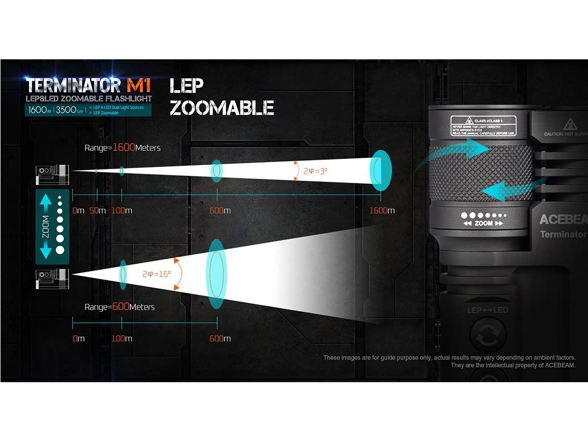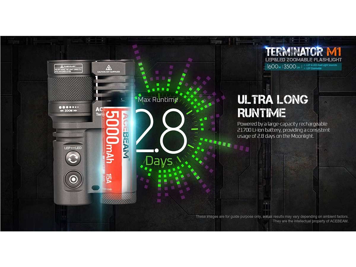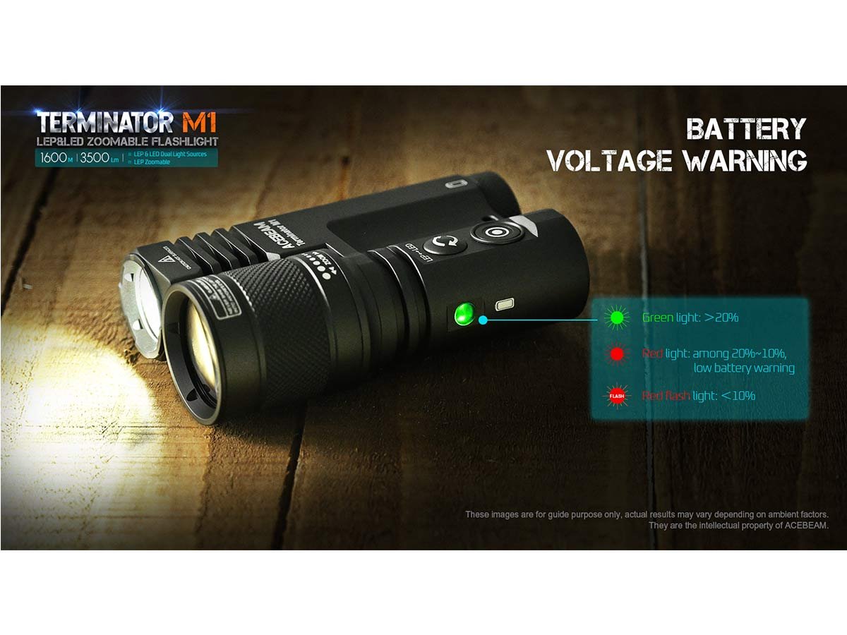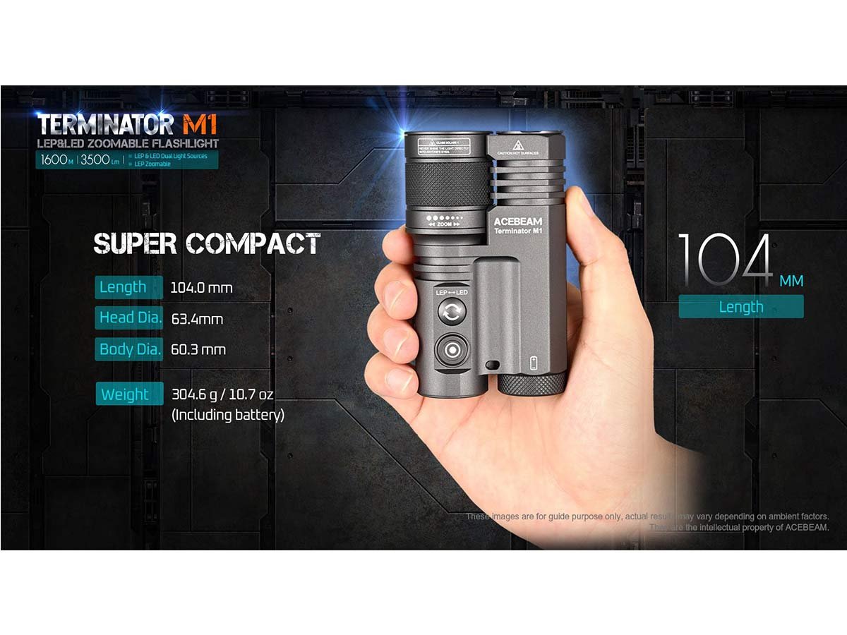 Acebeam's Terminator M1 is a flashlight that does everything you need! With a dual LEP and LED construction, you'll have the power of a spotlight and floodlight at your fingertips. Shine up to a mile away with the focused LEP's beam, or spread out and access 3500 lumens of floodlight with three high-powered LEDs. An added strobe mode enables users to signal for help in a pinch. The Acebeam Terminator M1 is the ultimate companion for workers, hikers, campers, or anyone in need of a powerful, flexible light.
