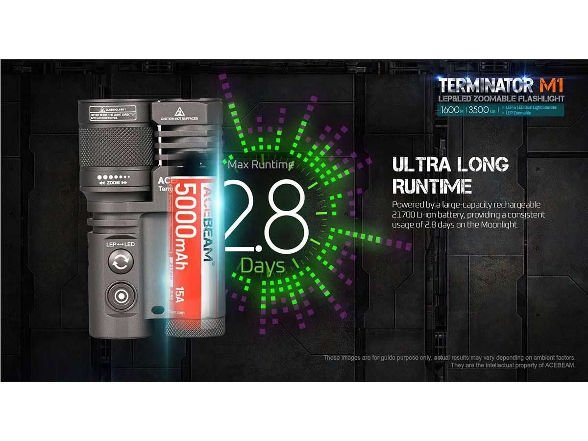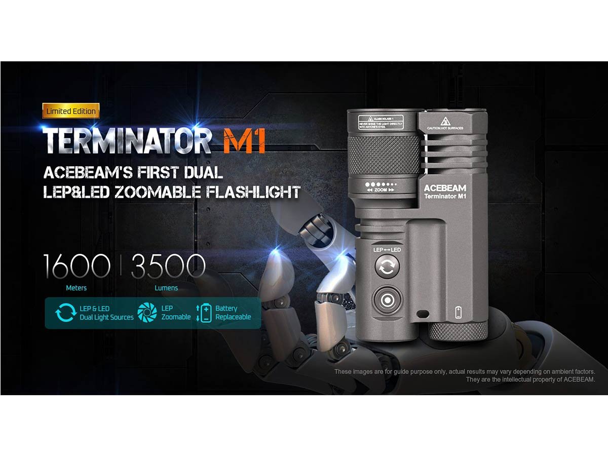 Acebeam Terminator M1 Dual Head LEP and LED Flashlight - 6500K or 5000K - Gray, Green, or MAO Marble Finish - Includes 1 x USB-C Rechargeable 21700