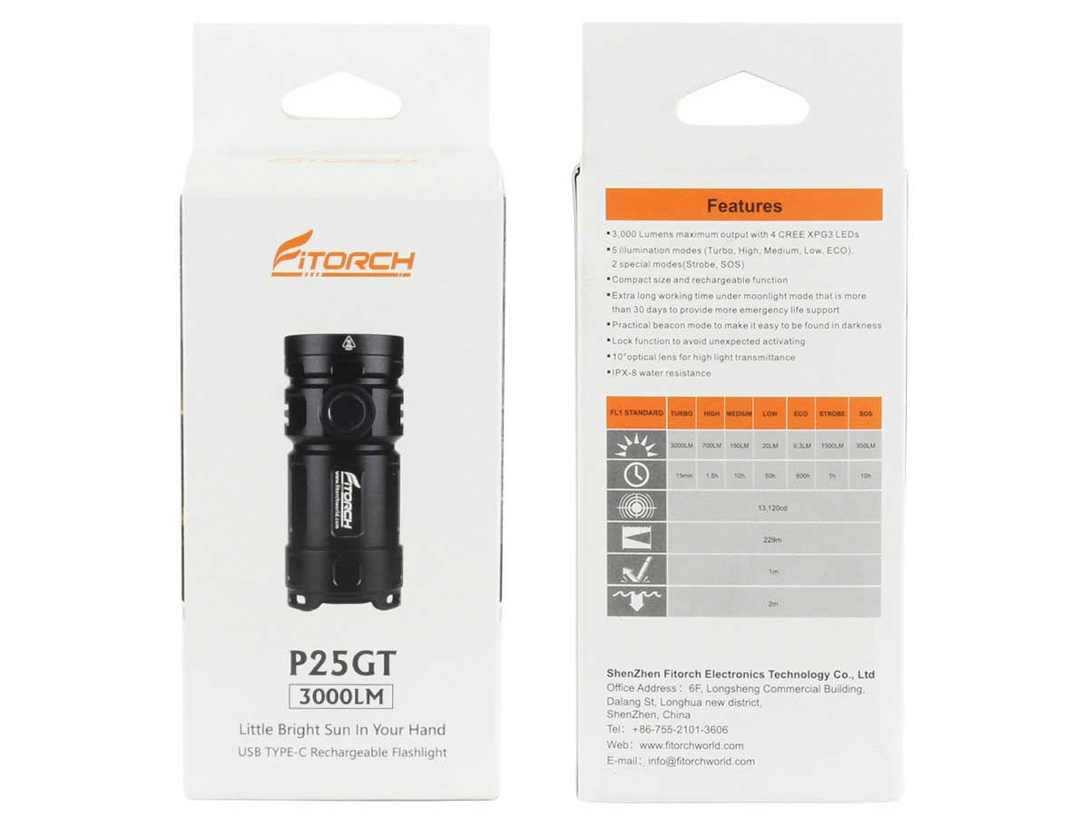 The new Fitorch P25GT is a high powered flashlight capable of producing up to 3,000 lumens, reaching 750 feet away. Access all five brightness settings and signaling (strobe and SOS) modes from one convenient side switch. The integrated side switch also doubles as a battery voltage indicator for real-time power monitoring without the need for an external tester or charger.