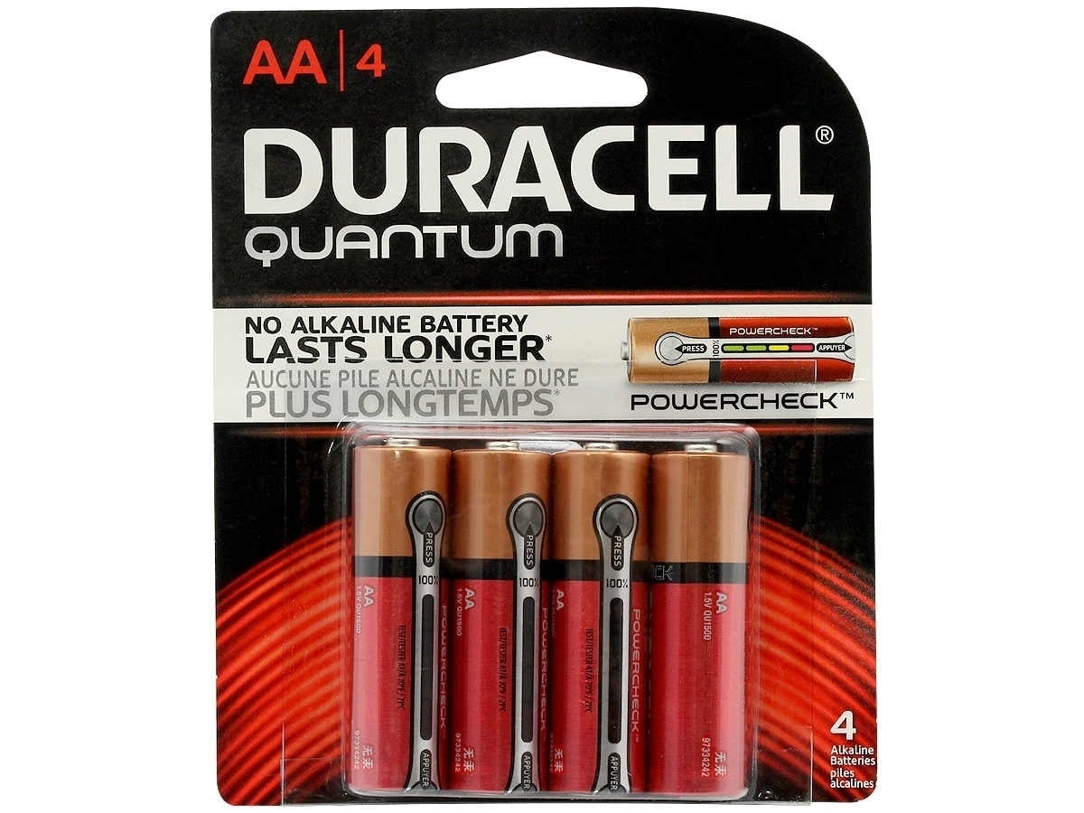 A 4 pack of power, the Duracell Quantum AA 4 pack is just what you need to power all of your favorite small electronics. Quantum batteries are superior to regular alkaline batteries thanks to their Hi-Density Core and Duralock Power Preserve technology, giving them long lasting power and a 10 Year Shelf Life. These batteries are perfect for immediate use or for storing away for an emergency, and they always perform perfectly. Duracell Quantum batteries are also equipped with the unique PowerCheck information strip, which displays the level of power.