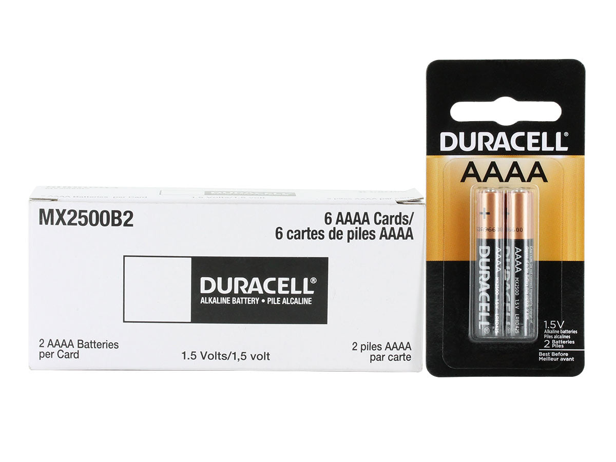 Duracell AAAA Battery MX2500 E96 MN2500 25A 4061 X91 - 2 Piece Retail CardDuracell AAAA batteries are a special alkaline battery that last up to 50 percent longer than your typical alkaline battery, making them perfect for use in the latest high-tech devices. If you want batteries that have a similar life to rechargeable AAAA batteries but you do not want to invest in an AAAA battery charger, these Duracell AAAA batteries are an outstanding alternative.Features: