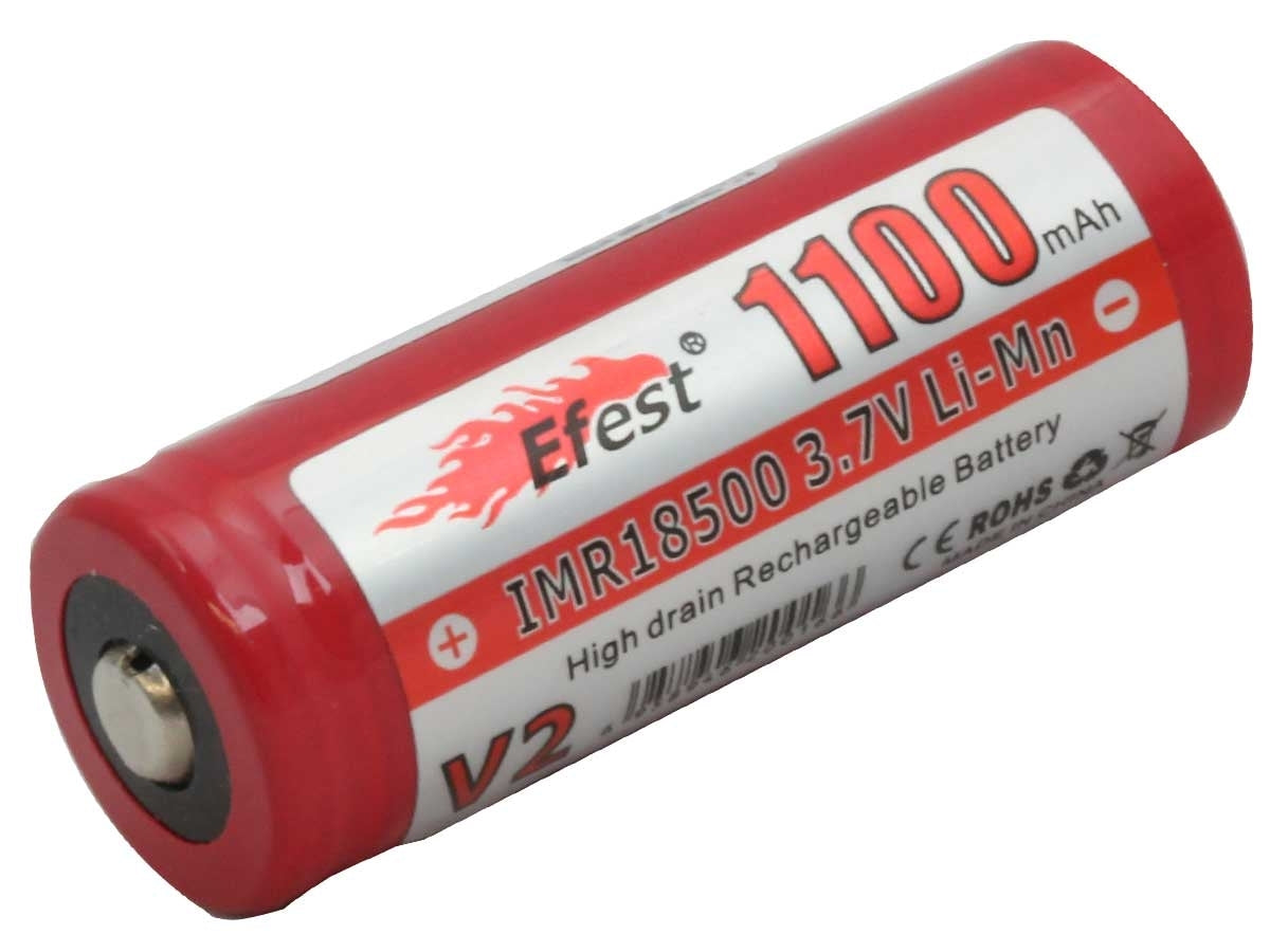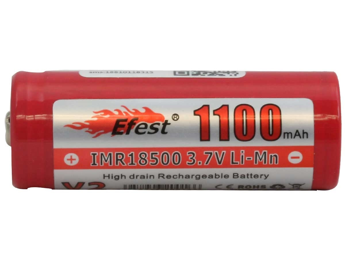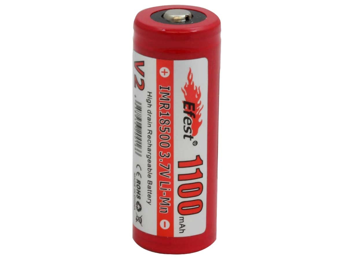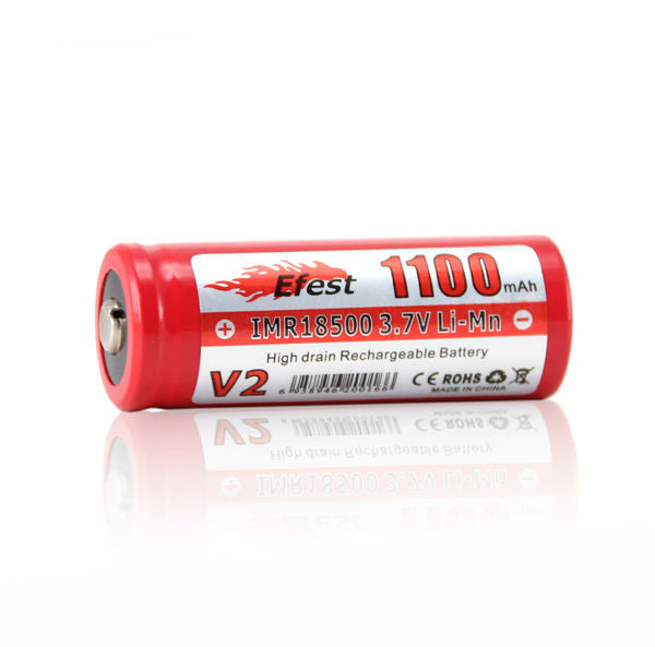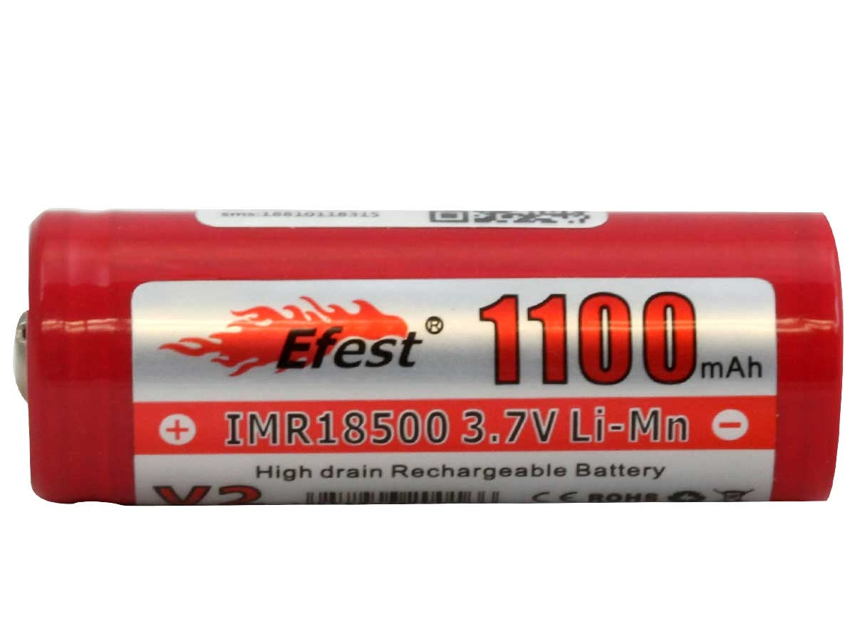 Efest IMR 18500 batteries are perfect for devices such as portable electronics. IMR chemistry batteries are the safest way to power your electronics. Since they use safer chemistry, they do not require a built-in protective circuit like ICRs do. These batteries contain 1100mAh, which will keep your devices powered for a long time. If you're looking for a reliable, high-quality and long-lasting power source, then the Efest IMR 18500 is the battery for you.
