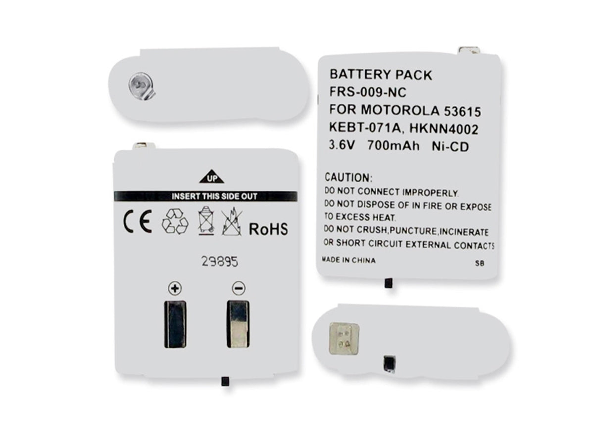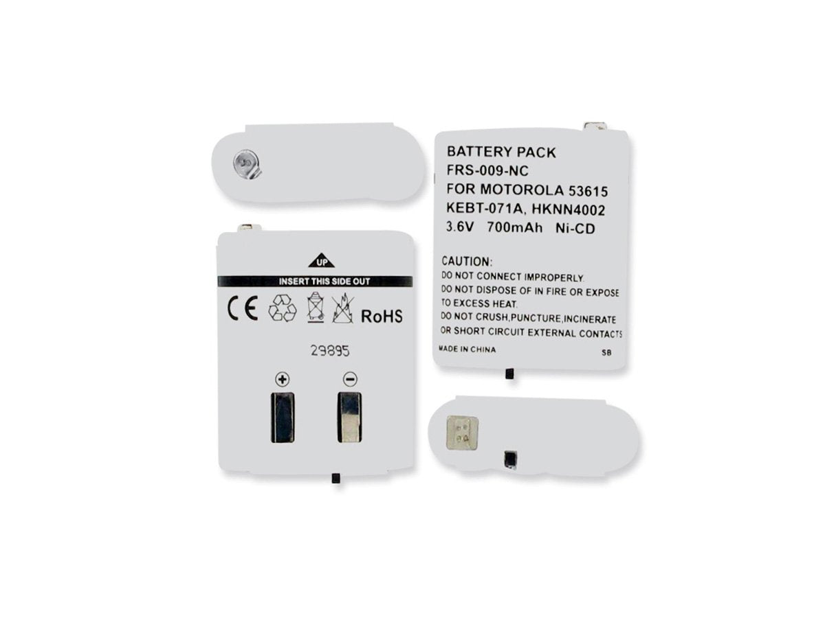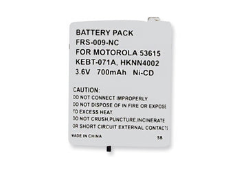 The FRS-009-NC is a rechargeable NiCd battery pack for Motorola 2-Way Radios. It is 3.6V, and carries a mAh rating of 700. The FRS-009-NC replaces more than a dozen Motorola battery models, and is power-compatible with over 60 2-Way radio models.