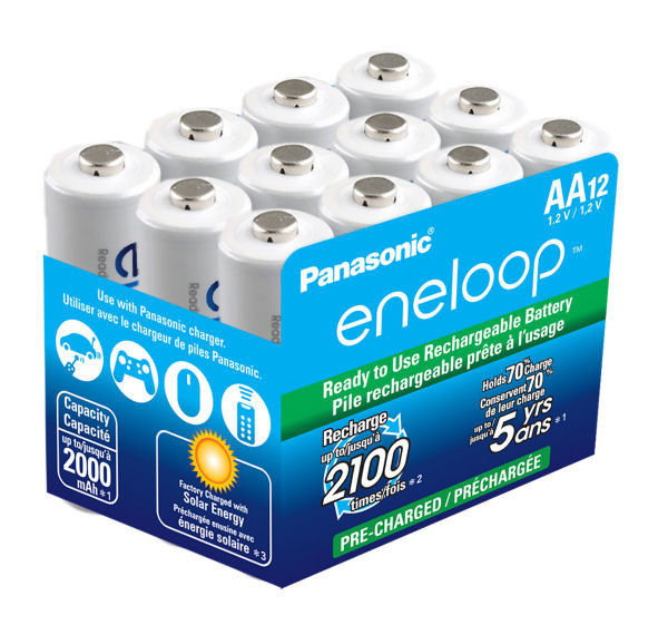 2000mAh NiMH low self-discharge rechargeable batteriesPanasonic Eneloop are the way to go if you are looking for long lasting, Low Self-Discharge AA batteries. Great for home and workplace electronics, these batteries feature an impressive 2000mAh capacity that keeps them running longer than competing rechargeable batteries. Their low self-discharge nature allows them to hold a charge for extended periods of time while not in use, maintaining 70 percent of their total capacity for up to 10 Years! Eneloop rechargeable batteries remain healthy for up to 2100 Charge Cycles and are a great choice for saving energy and going green. This pack contains 12 AA-sized Eneloop batteries and comes shrink wrapped to provide the best value possible.