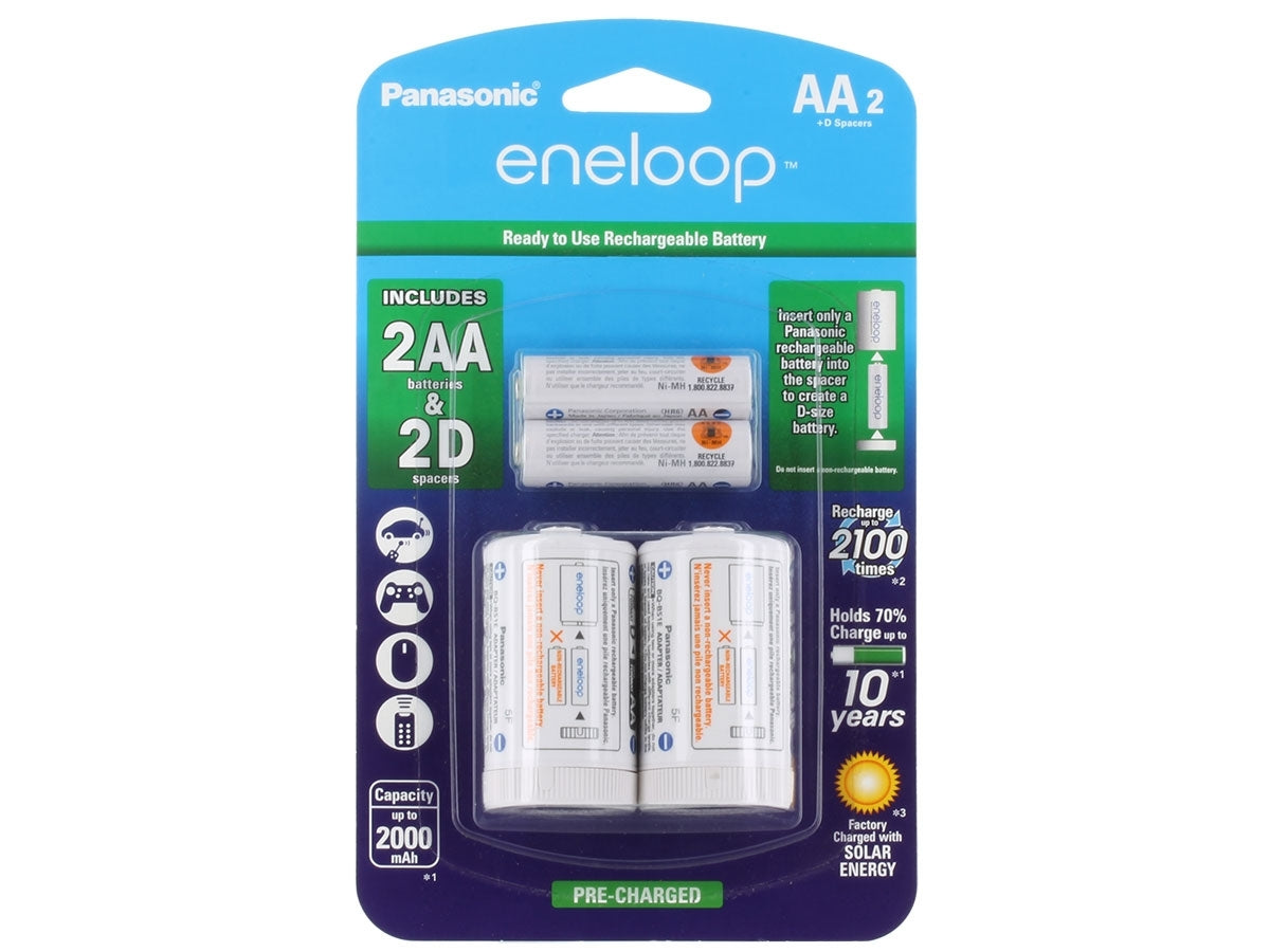 For all of your devices that require D-Cells, use them with the unique low self-discharge power of Panasonic Eneloop as alternatives. This kit come equipped with 2 powerful AA sized NiMH Eneloop batteries that feature high capacity and extremely low self-discharge, perfect for long term storage or emergency kits. Also included are 2 D-cell spacers that convert the AA batteries in to a larger battery for use in big electronics such as clock radios and baton style flashlights. Eneloop batteries are packed with 2000mAh of energy capacity and are good for up to 2100 charge cycles. While using the converters, they keep the same characteristics and qualities of the AA battery, through capactiy, voltage, and charge cyclees. Save the cost of frequent replacements with the Panasonic Eneloop.