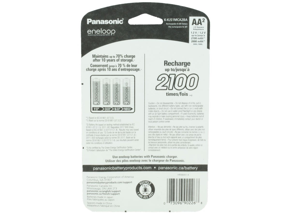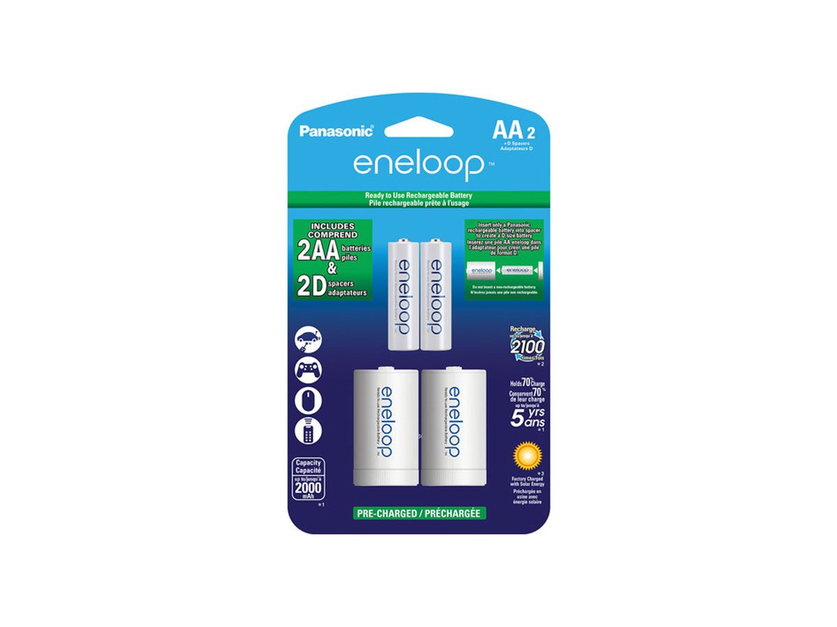 Panasonic Eneloop K-KJS1MCA-2BA AA 2000mAh 1.2V Low Self Discharge Nickel Metal Hydride (NiMH) Button Top Batteries with D Cell Spacers - 2 Pack Retail Card