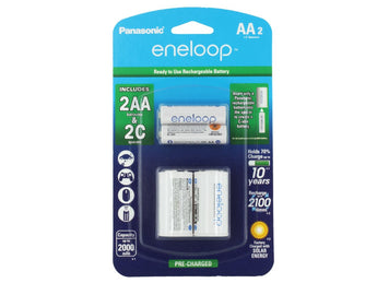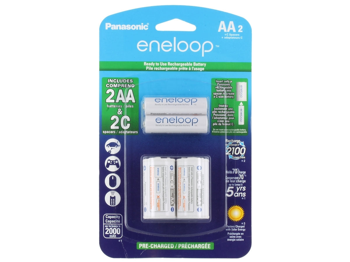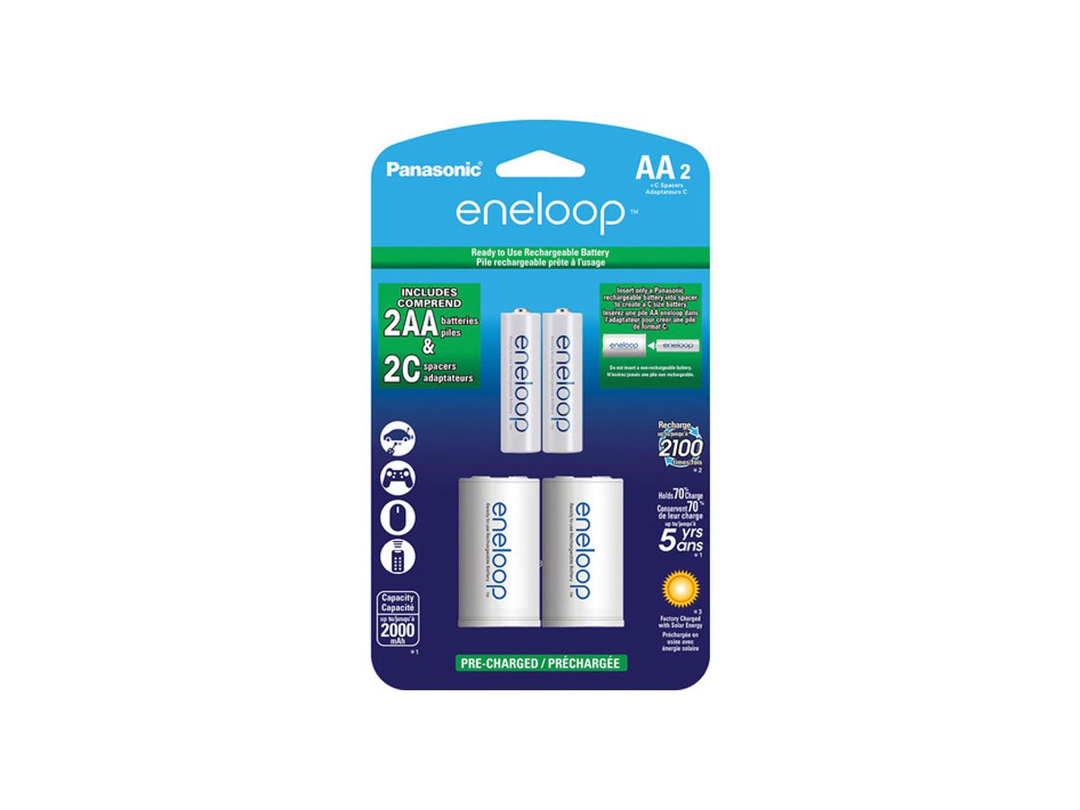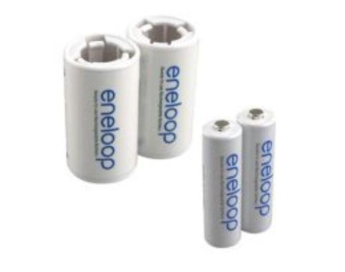 Bring the low self-discharge power of Panasonic Eneloop batteries to your C-cell devices with this great combination of AA Eneloop batteries and C-cell spacers. Panasonic Eneloop batteries are high quality NiMH rechargeable power sources that feature high capacity and an extremely low self-discharge that keeps them powered up even when in long term storage. The additional C-cell spacers allow you to convert any AA sized battery in to the larger size battery - perfect for certain clock radios, flashlights and other electronics that require larger batteries. Eliminate the hassle of frequent replacements with the Eneloop converters. Suitable for rechargeable home electronics.