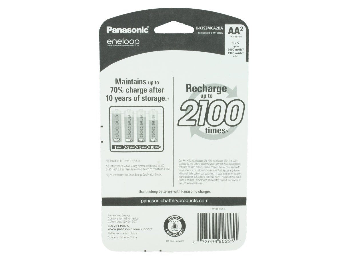 Panasonic Eneloop K-KJS2MCA-2BA AA 2000mAh 1.2V Low Self Discharge Nickel Metal Hydride (NiMH) Button Top Batteries with C Cell Spacers - 2 Pack Retail Card