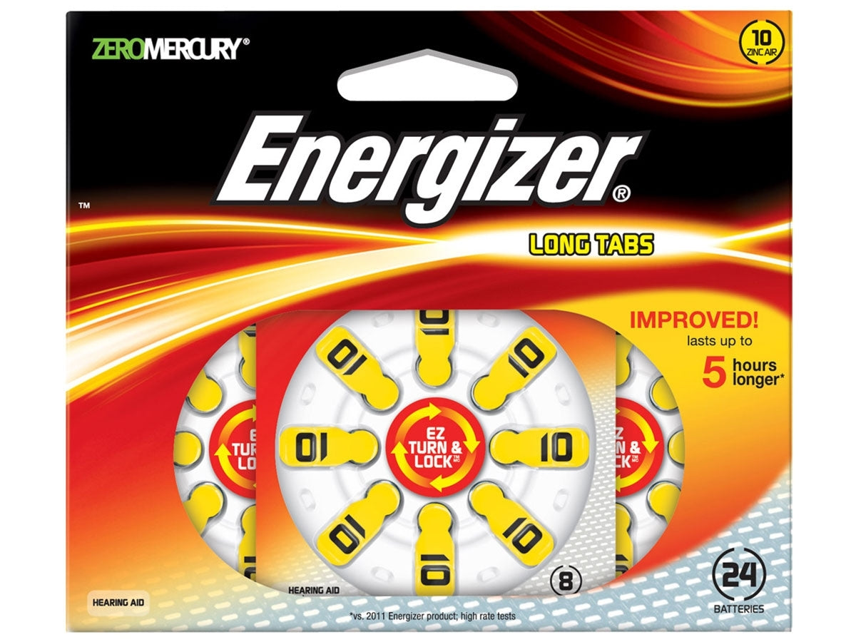 - » Size 10 (yellow tab) hearing aid batteries in a package of 24