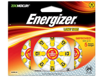 Long lasting and reliable, the Energizer AZ10 is a high quality hearing aid battery that is great for constant, everyday use. Powerful Zinc Air chemistry provides constant power that will keep your hearing aid powered up longer and more consistently than competing batteries. These batteries are completely Mercury Free, and are completely safe for the environment and convenient to dispose of. This pack contains 24 total size 10 hearing aid batteries.