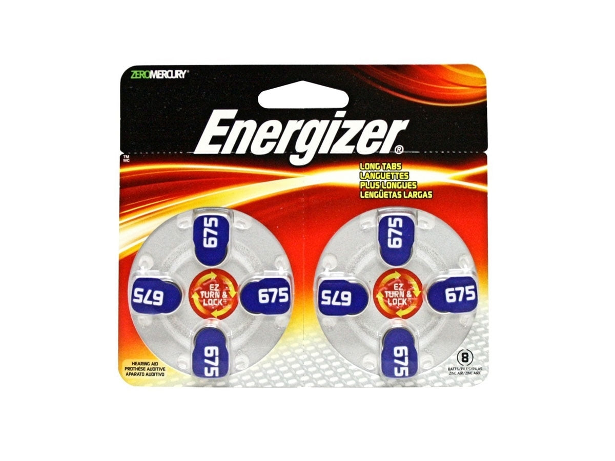 These Energizer 675 dependable, long-lasting hearing aid batteries are packaged in an easy-to-use dispenser. The 675 is made up of Zinc Air and is totally mercury free, leaving less of a foot print on the environment. A protective tab on each battery makes them easy to handle and is removed when the battery is used. Removing the hearing aid battery from the EZ Turn & Lock package makes replacing them a breeze and with eight batteries to a package, you'll be good to go.Features and Specifications:- Long lasting