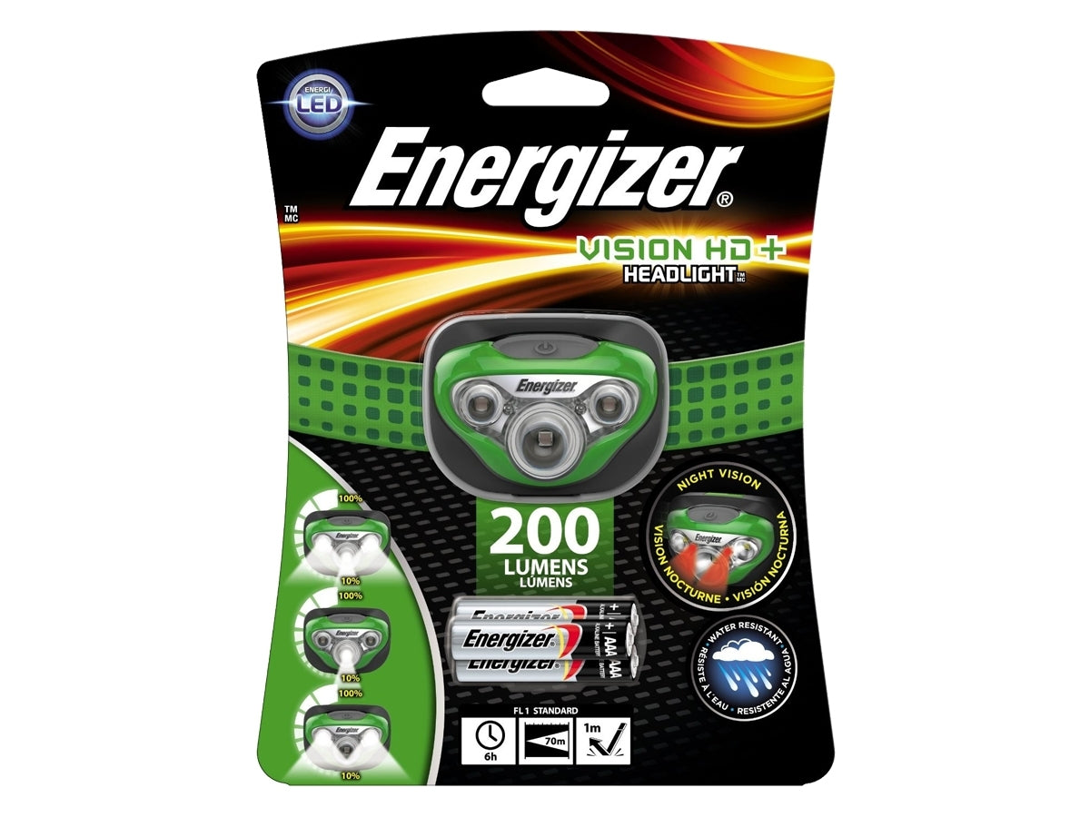 Ultra reliable LED lighting on a head mounted unit, the Energizer Vision HD+ is a weather ready headlamp that combines durability, power and affordability. This headlamp features 4 unique lighting modes including spot and flood lights, a combination spot/flood mode and a red light for enhanced night vision. Adjustable brightness levels and a 250 Lumen maximum output make this an incredibly flexible tool for everyday or emergency lighting. The package includes the headlamp as well as 3 Energizer MAX AAA batteries, so the Vision HD+ is ready to as soon as you open it.