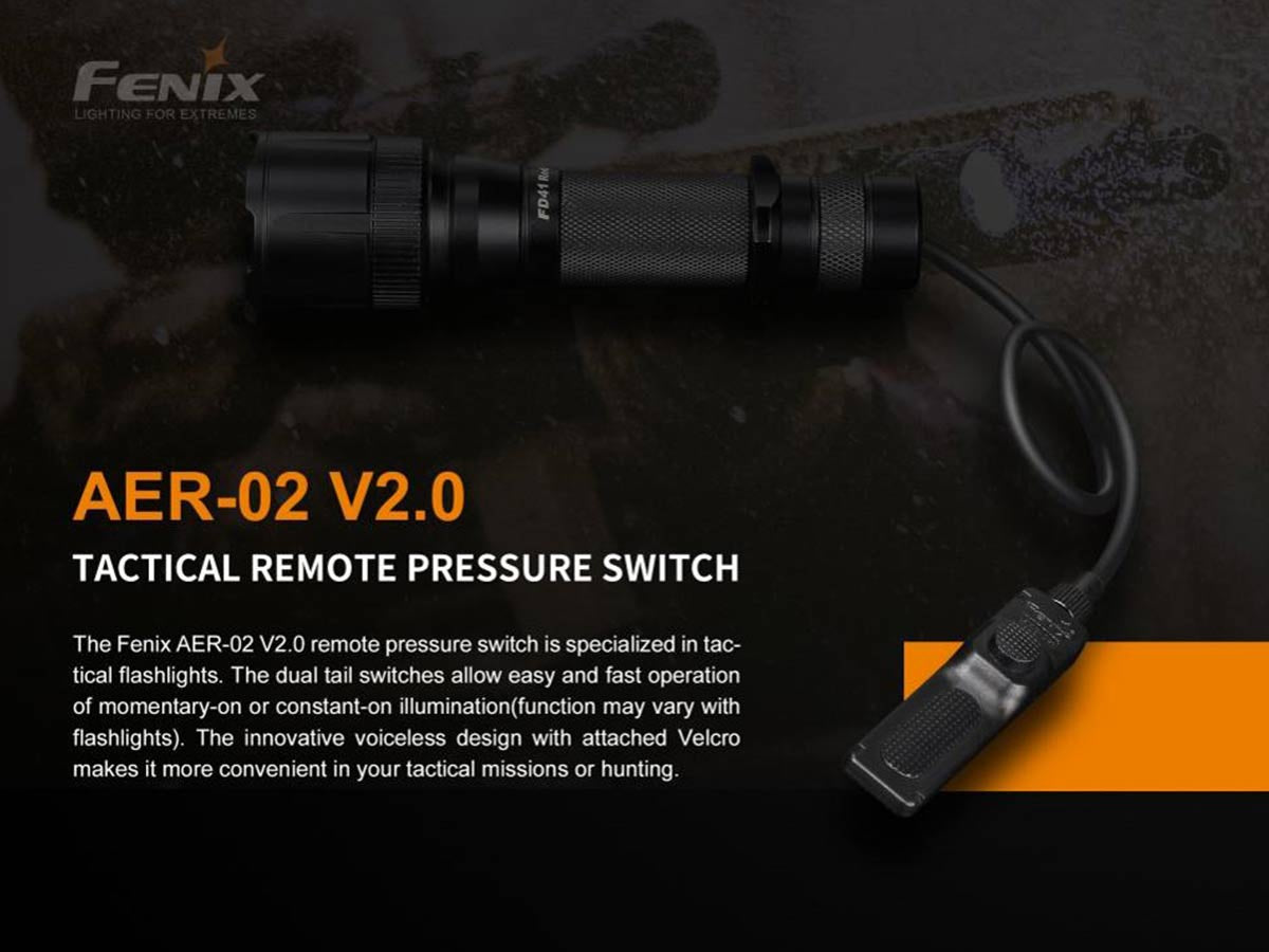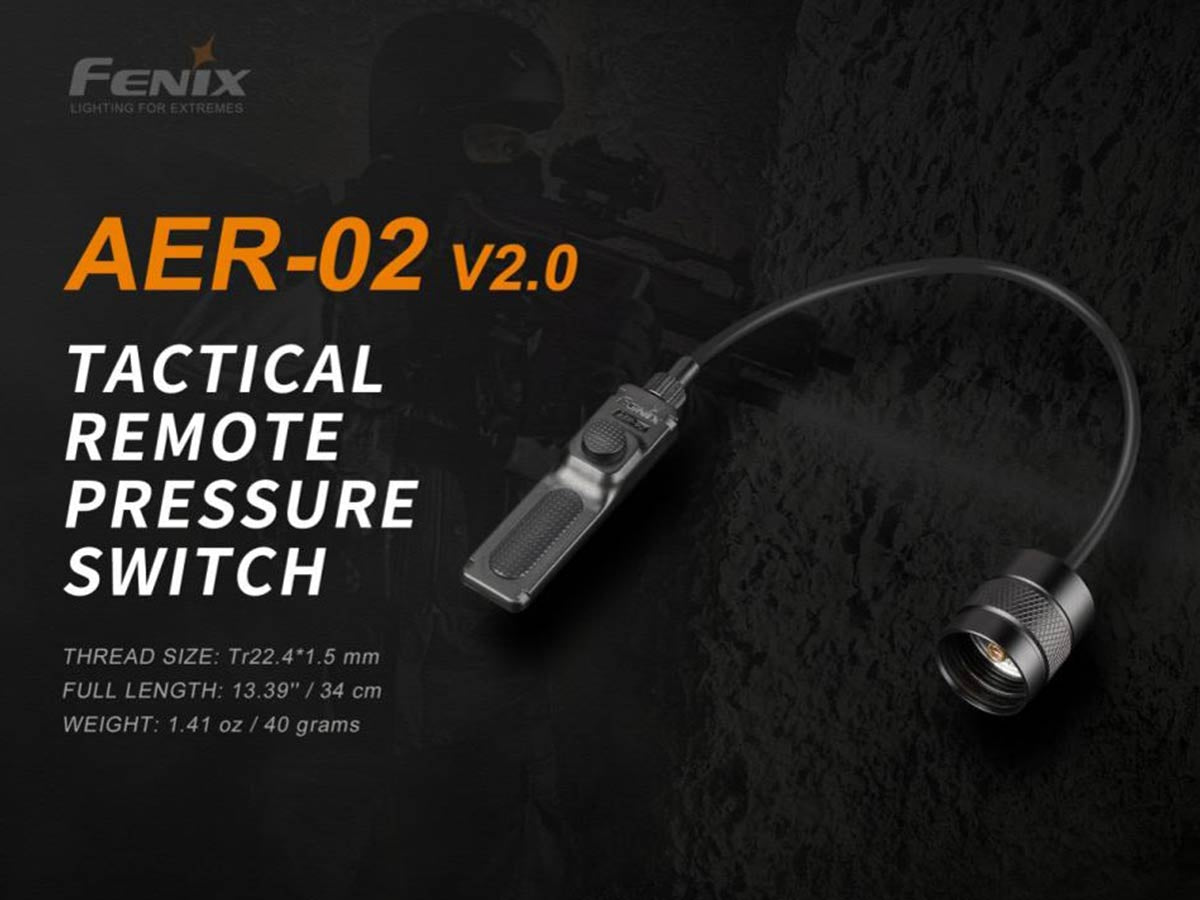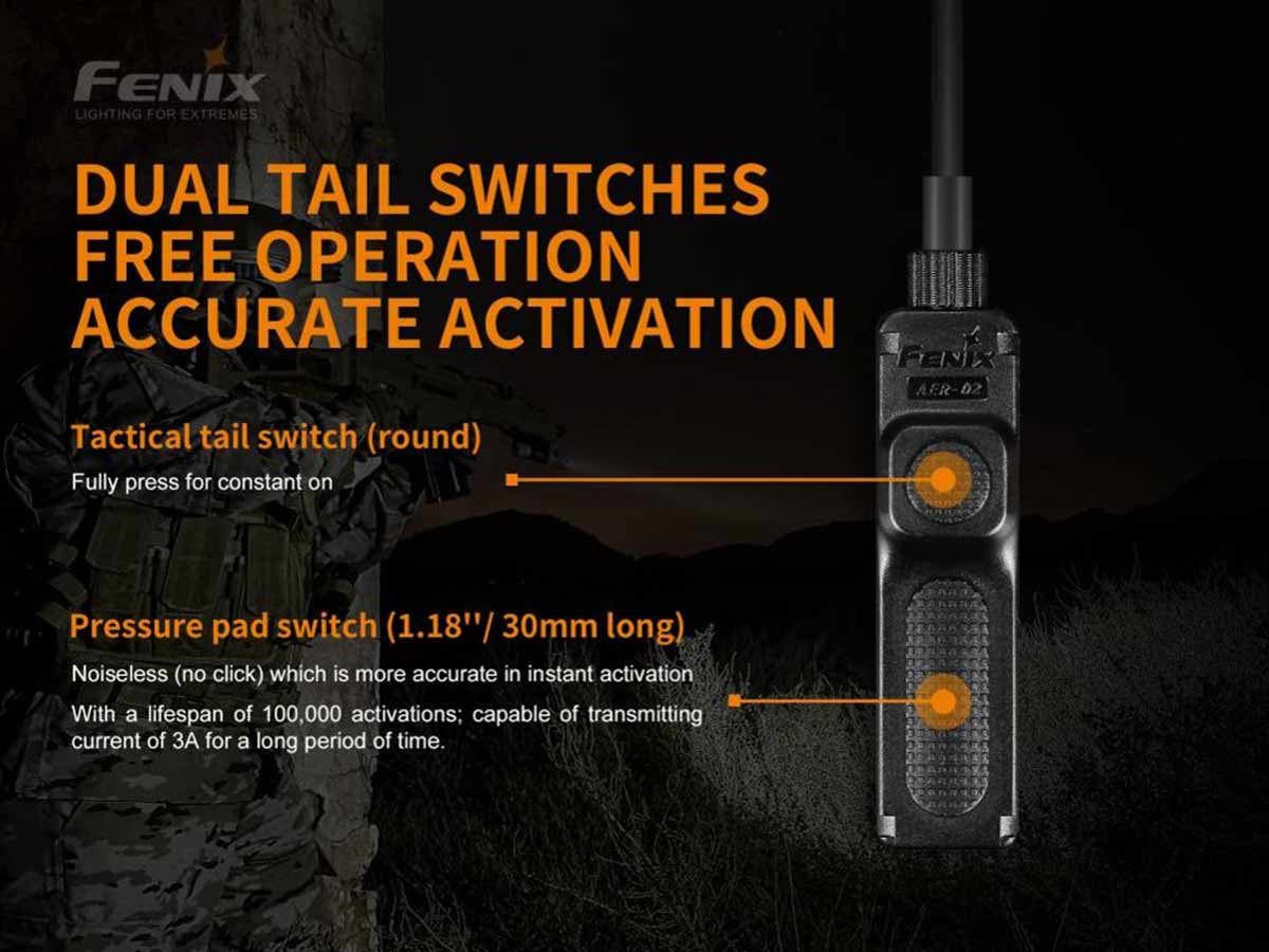 The new Fenix AER-02-V2 Remote Pressure Switch is the straight cable edition of the ever-popular Fenix AER-02 Coiled Cord Remote Pressure Switch. The straight cable length is perfect at just over 9", you never have to fumble with tangled wires again. This switch provides simple but fast activation of your favorite compatible Fenix flashlight in tactical and hunting situations. The dual switches allow you to access a constant on with the smaller round (tactical tail switch) button, and the longer pressure pad button provides instant activation.