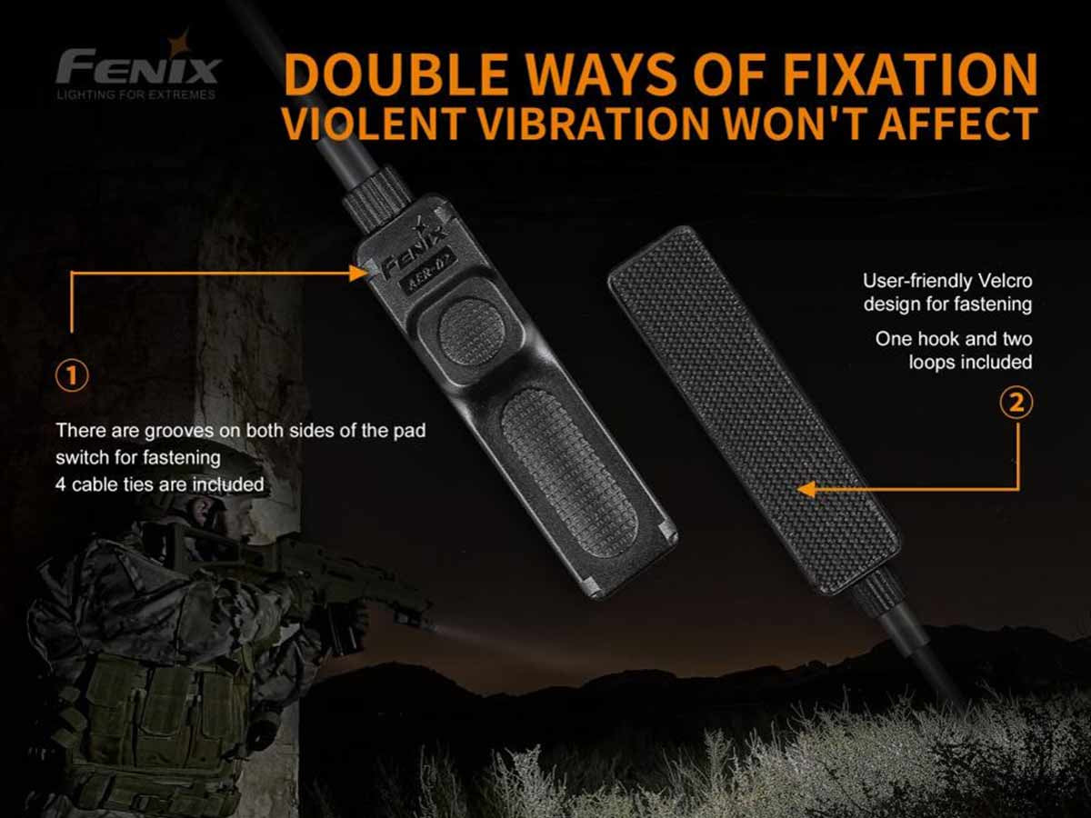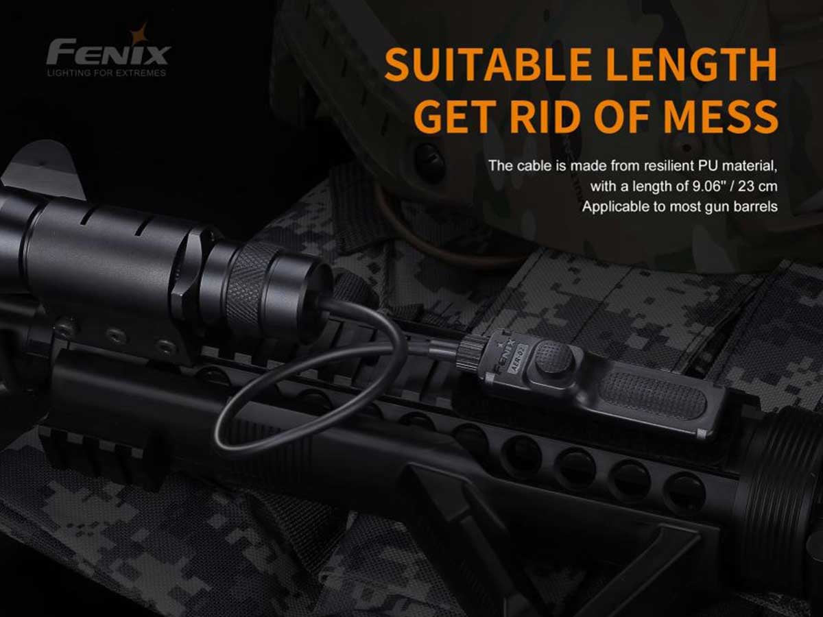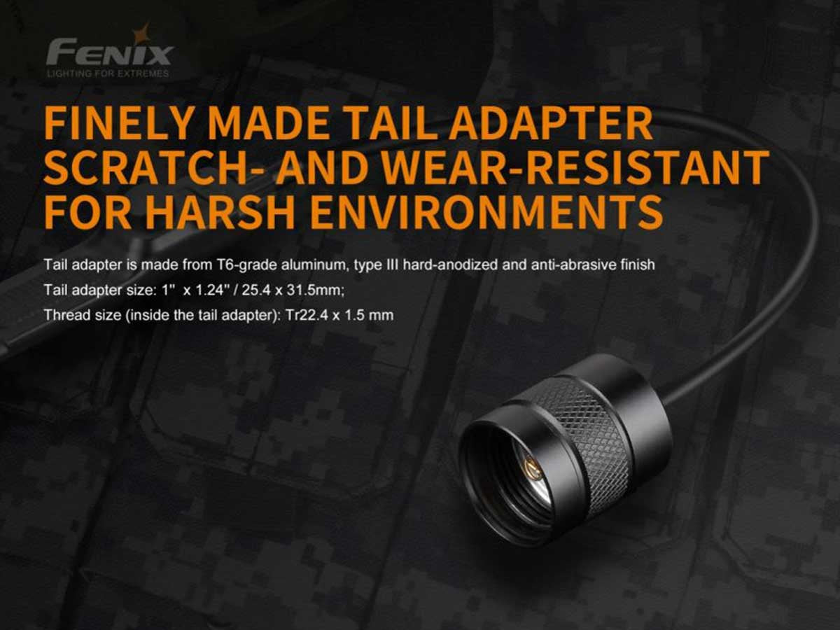 Easily attached to almost any gun barrel, the AER-02-V2 comes with two different options for mounting it to your weapon. The switch has two grooves at the top of the pad that allows for secure fixation with the provided cable ties. The velcro option is user-friendly with an easy fastening design that can be placed almost anywhere. Both ways are incredibly sturdy and not affected by vibration or recoil during use. The tail adapter was built from premium T6-grade aluminum and has a Type III hard-anodized, anti-glare, and anti-abrasive finish for ensured durability that won't reflect the shine of another light. The cable is made with durable polyurethane material that is built to withstand tactical and environmental punishment. Add a Fenix ALG-01 Flashlight Ring for the ultimate Fenix hunting or tactical lighting package!