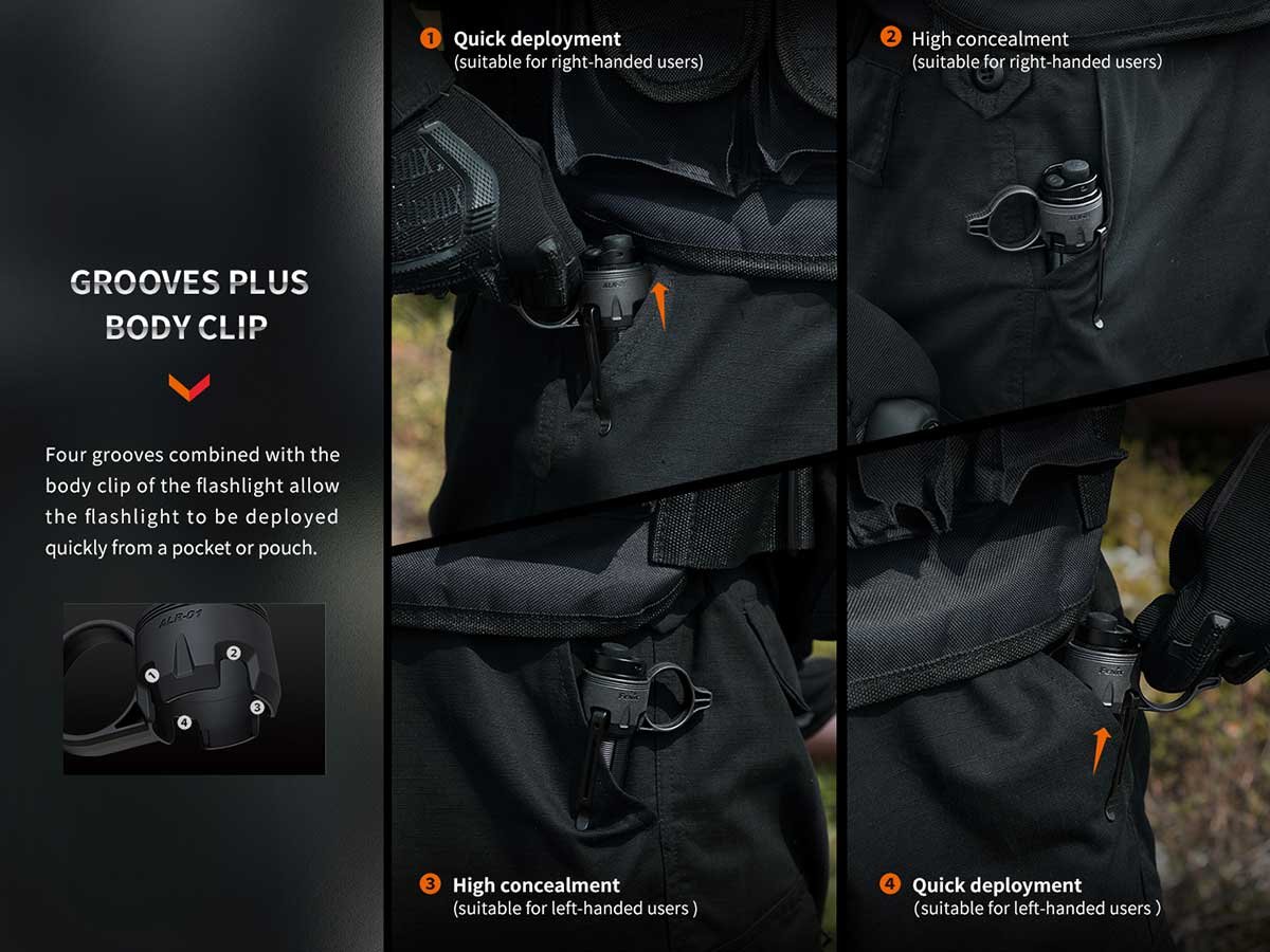 • Grooves allow for use with flashlights that have clips