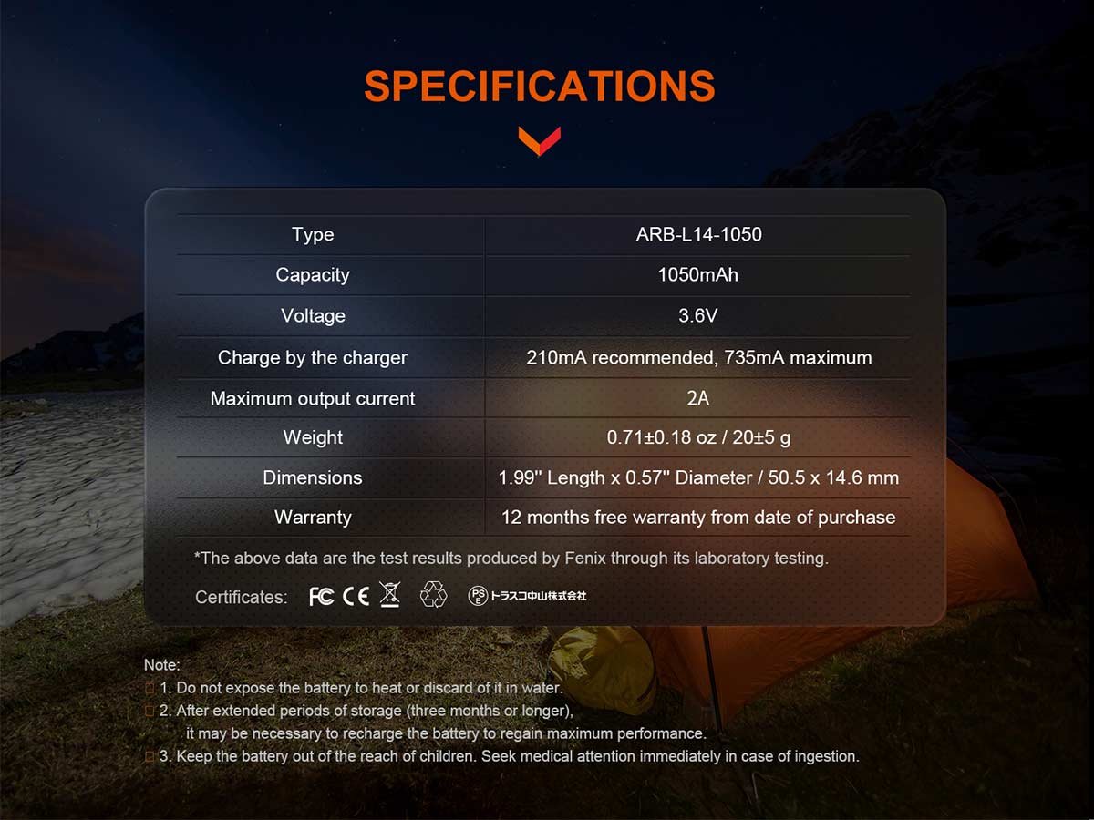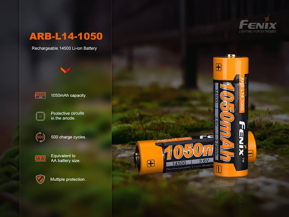 If you're looking for a 14500 battery to power up your flashlight, check out the Fenix ARB-L14-1050! This AA-sized Li-ion 14500 has a 1050mAh capacity, retaining power for reliable runtimes. There are multiple safety protections found in the Fenix ARB-L14-1050, including overheat, overcharge, over-discharge, and short-circuit protection.
