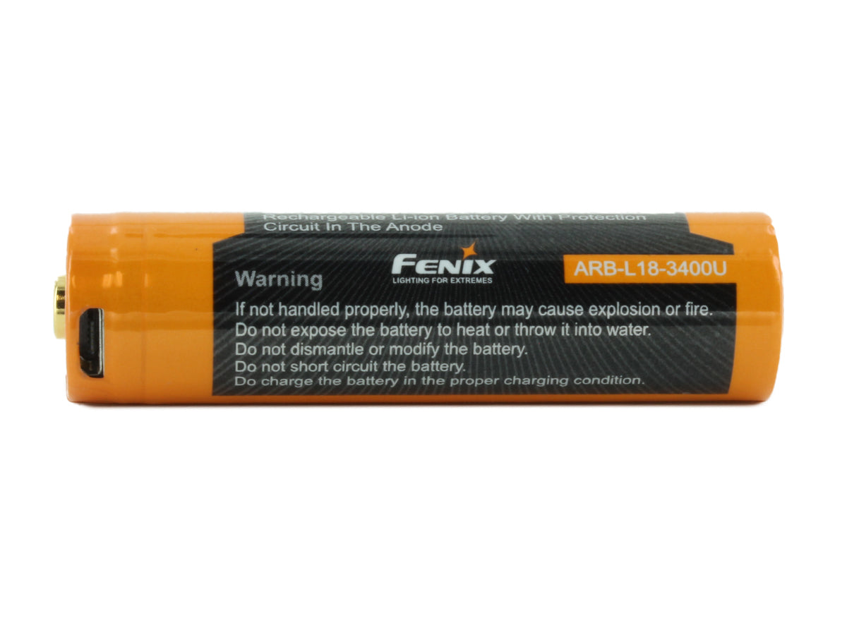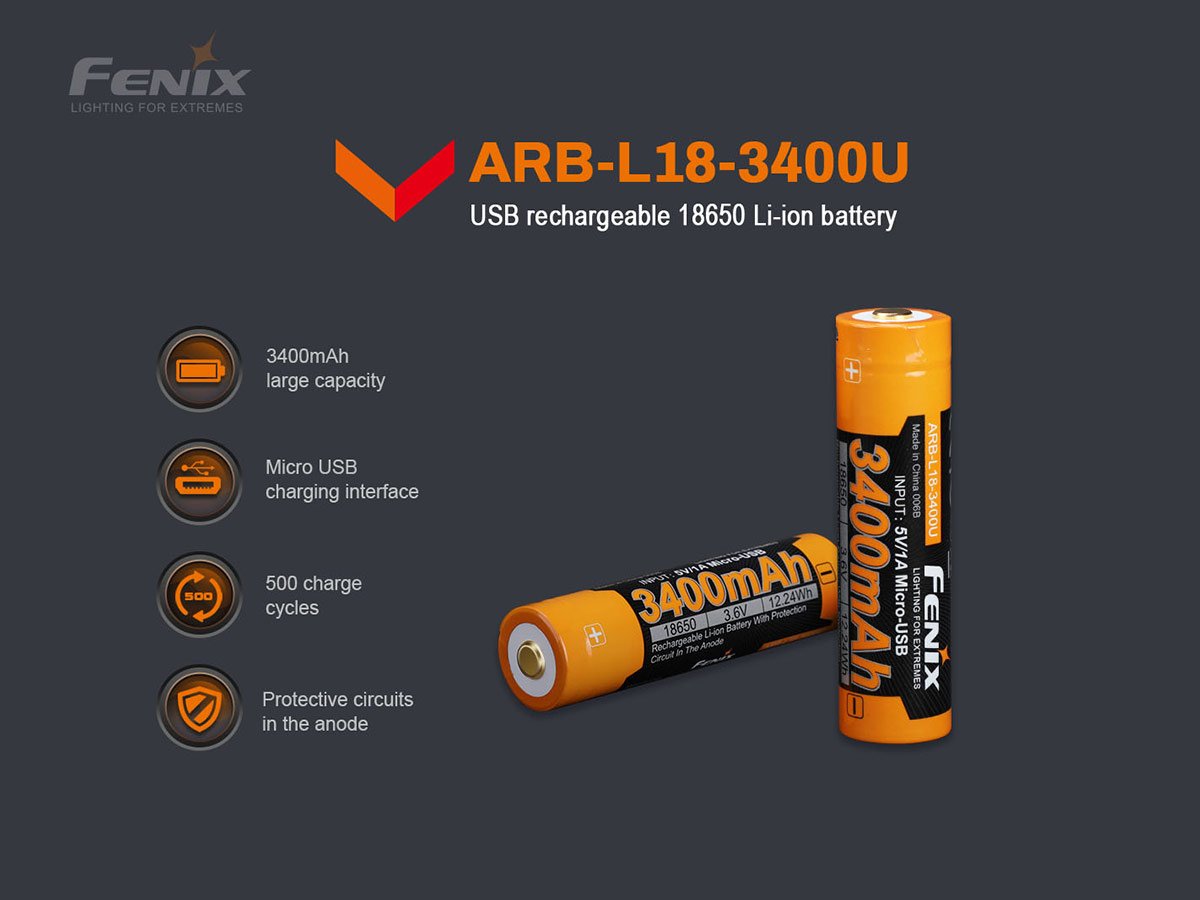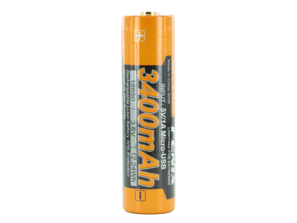 Fenix ARB-L18-3400U 18650 3400mAh 3.6V Protected Lithium Ion (Li-ion) Button Top Battery with Micro USB Charging Port - Clam Shell