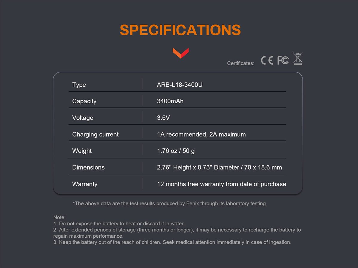 If you want your flashlight to have reliable power, use the Fenix ARB-L18-3400U 18650 Protected Li-ion Button Top Battery! With a massive 3400mAh capacity, this battery provides long runtimes for your favorite devices like a flashlight. With 500 charge cycles, this battery is reusable for years.