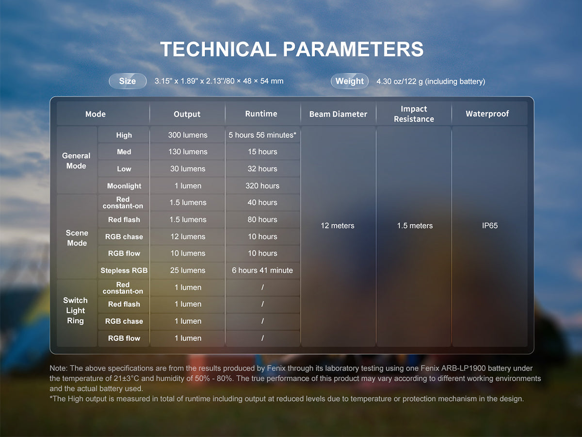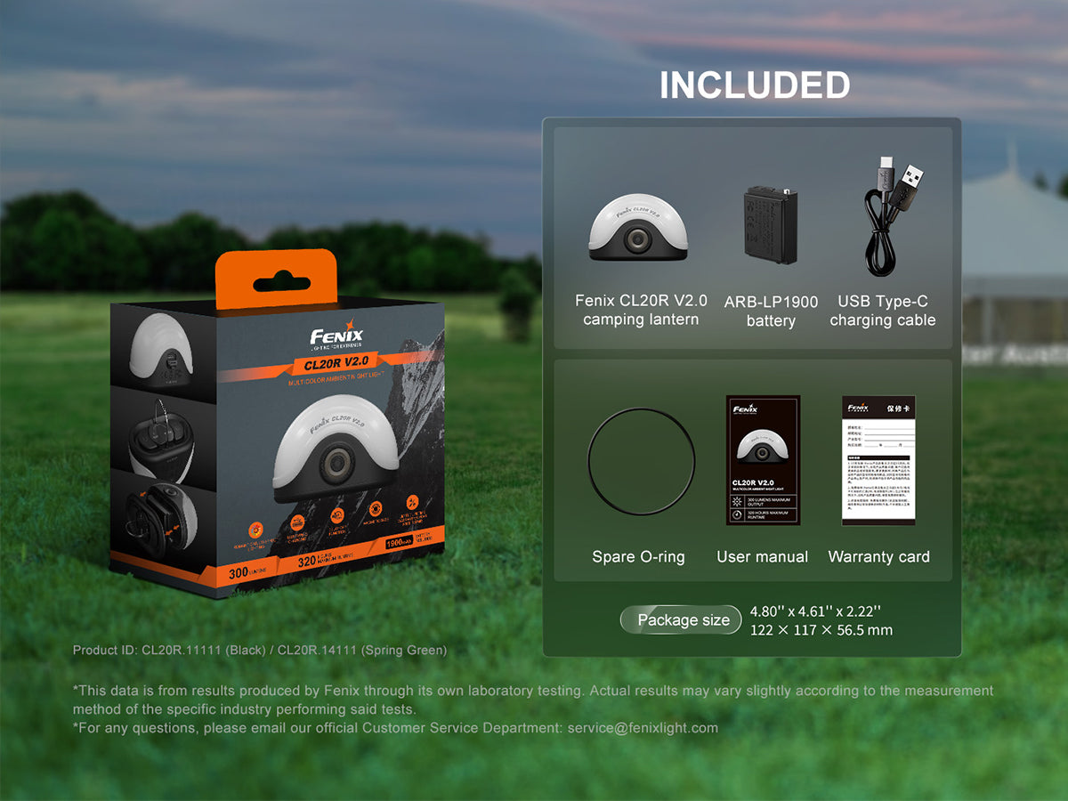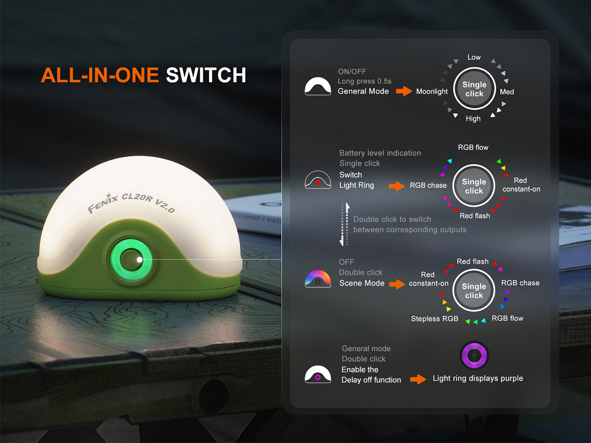 If you're looking for a simple lantern for your next camping trip, the Fenix CL20R V2.0 is for you! With a max 300 lumens, this lantern delivers plenty of brightness for any activity, from prepping for an extended hike to relaxing in your tent at the end of a long day’s journey. Pair that with its lightweight build and a conveniently attached clip, and you can bring this with you anywhere! With a magnetic base, you can attach it to metal and have more hands-free light capability. Hang it from your tent, attach it under the hood, and clip it to your backpack; With the CL20R V2.0, convenience is key!The CL20R V2.0 even sets the right vibe for backyard bashes, with fun multicolor light effects! With RGB chase, RGB flow, stepless RGB modes, and more, you have the fun flair you need to bring life to the party. Red constant and flashing light modes can preserve your natural night vision or signal for help, outdoors or attached to the back of your vehicle.