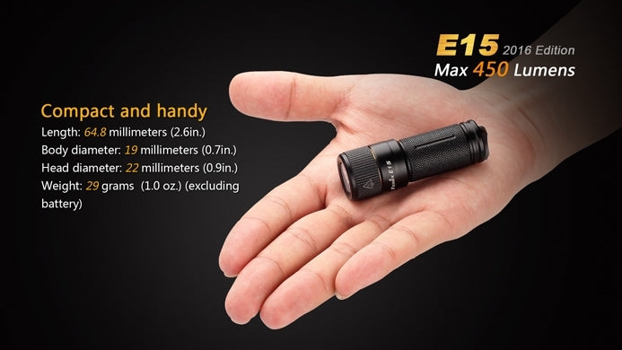 Compact twist head every day carryThe classic Fenix E15 is a little light that is back in a big way! This light has been re-tooled from the ground up, and now has a massive 450 Lumens of output, up from 120. The light still features the popular twist head interface that allows users to turn it on or off and cycle through multiple modes with a simple twist. Most notable this light is pocket sized, measuring under 2.6 inches, making it a perfect EDC for anyone that doesn't want to be weighed down by their high power LED flashlight.