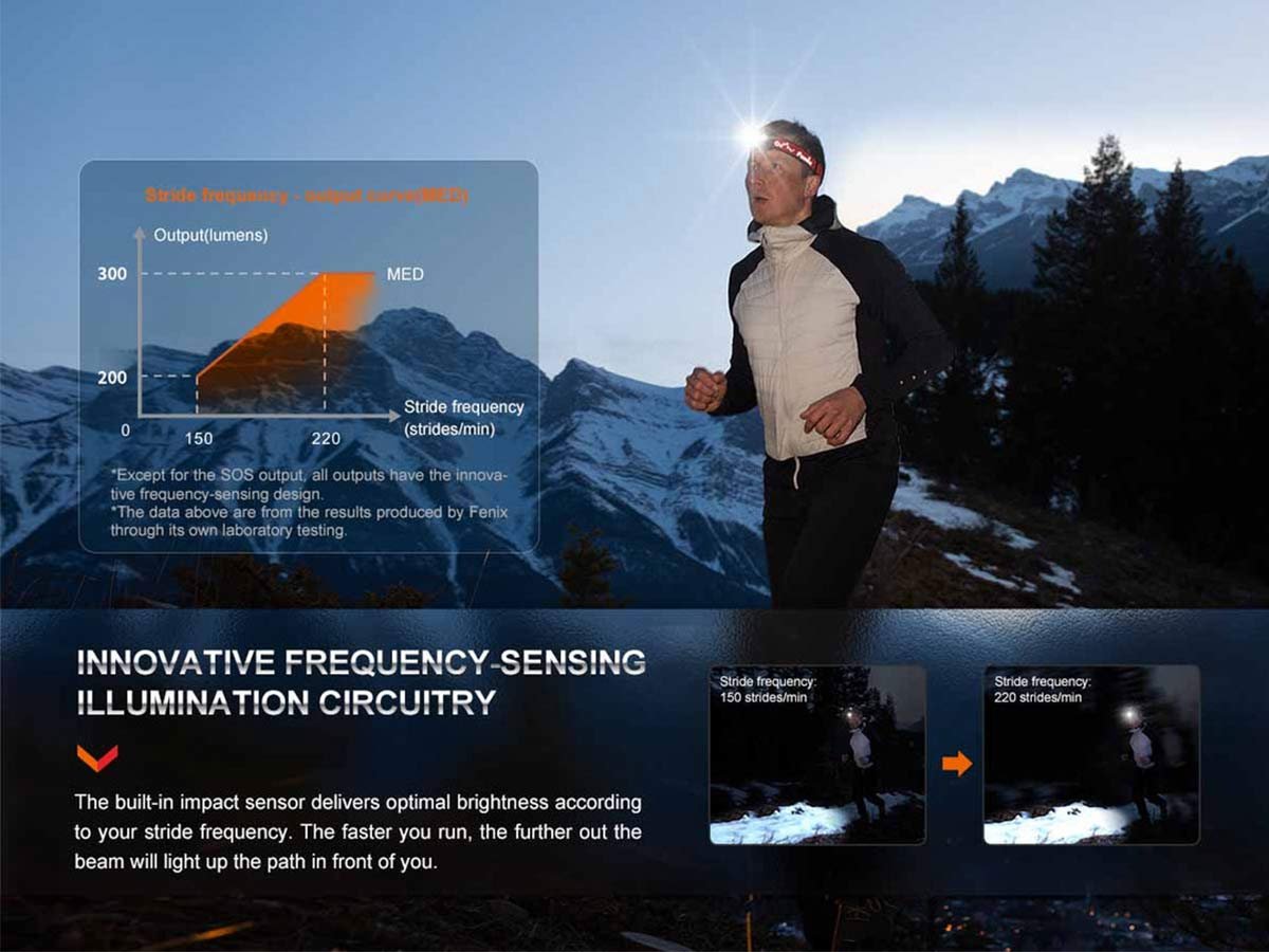 The HL32R-T is specially constructed to prioritize active users. Thanks to its frequency-sensing illumination circuitry, the headlamp adjusts brightness depending on your active speed. When running faster the light beam further illuminates your immediate path automatically. As a result, you have a safer experience on your run after work.