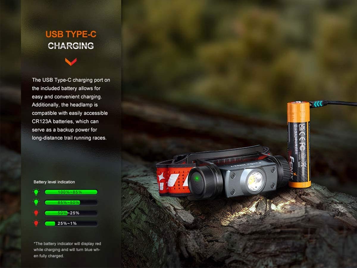This headlamp is dual-fuel compatible and can run with the included 18650 battery or 2 CR123As. Recharge or replace batteries with the HM62-T and power up with what is convenient for you. Recharge before you head out or replace while active outdoors! The included battery is rechargeable via USB-C, giving you a rapid and modern charge system so you can depart on your adventure in no time. It has a 3400mAh capacity which offers a whopping 280-hour runtime on the lowest mode.