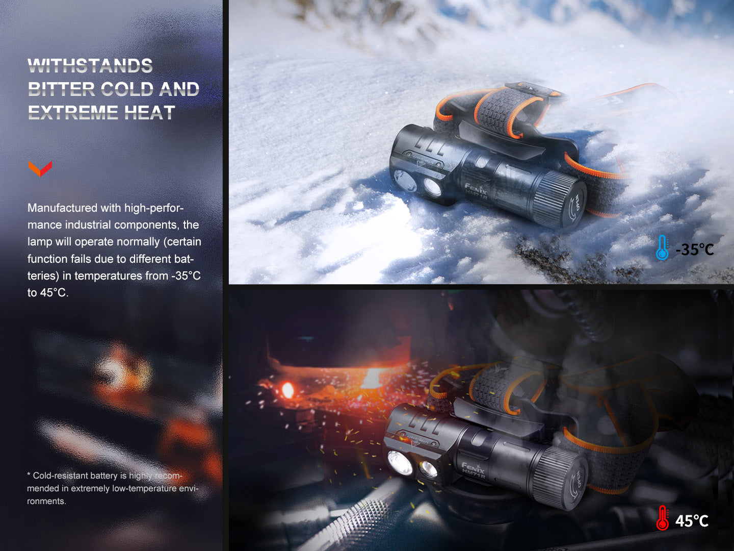 For tough jobs in construction zones and rough conditions while caving or exploring the woods, you need a headlamp that can keep you safe, so pick up the Fenix HM71R! With its spotlight mode's maximum output of 2700 lumens in a 755ft beam through the Luminus SFT70 LED, this headlamp is great for spotting hazards on the job or difficult sections of hiking trails. Its floodlight mode's maximum output, which uses the Luminus SST20 90 CRI LED, of 500 lumens can run for up to 8 hours, perfect for illuminating your campsite or reading the finer details of maps and blueprints.