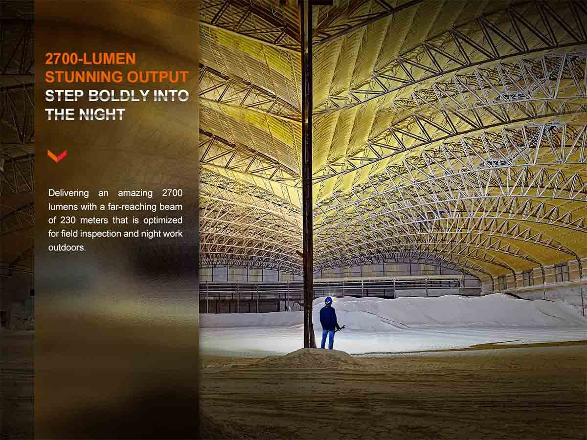 - Spotlight mode's max output of 2700 lumens creates a 755ft beam