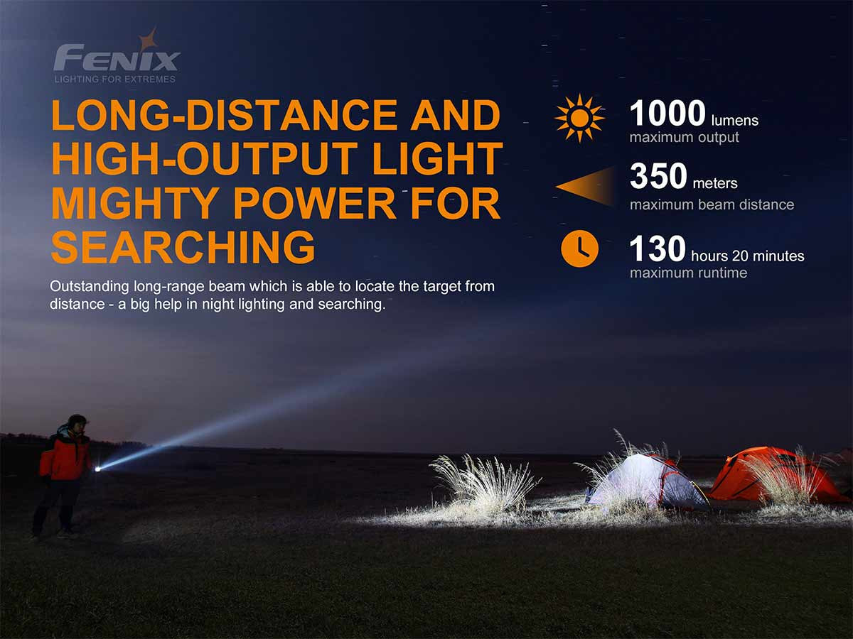 The max output for this light is 1000 lumens that can reach up to 350 meters away! The long range beam is ideal for night adventures, searching and spotting. The five modes provide you with brightness levels that can be used for close to mid range lighting tasks as well. On the lowest brightness mode, it has a maximum run time of 130 hours! That is over 5 days of lighting without needing a battery refresh! When the last of your power is used, the LD42 is powered by one of the most commonly found batteries in the world - the AA! It accepts 4 x AA alkaline (included) or Ni-MH batteries for your power consumption convenience. No need to worry about your batteries draining when not in use, this flashlight comes with "No standby Current" circuitry. This feature preserves your battery power in standby status while keeping the batteries and flashlight safe from leakage - saving you money! Let Fenix show you how technical innovation with the LD42 can make your lighting experience that much better!